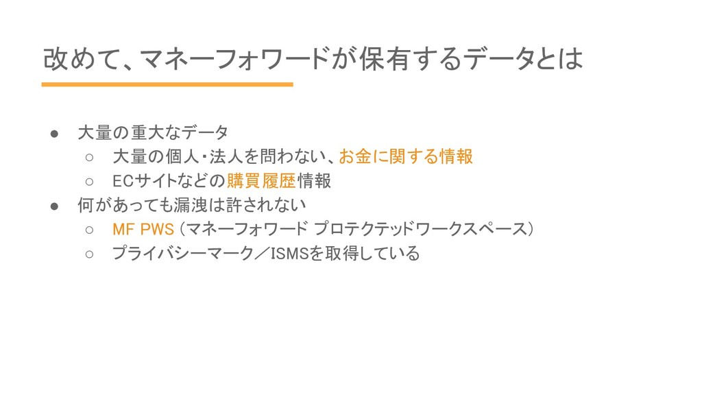 改めて、マネーフォワードが保有するデータとは • 大量の重大なデータ ◦ 大量の個人・法人を問わない、お金に関する情報 ◦ ECサイトなどの購買履歴情報 • 何があっても漏洩は許されない ◦