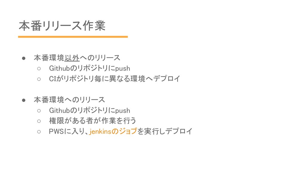 ◦ Githubのリポジトリにpush ◦ 権限がある者が作業を行う ◦ PWSに入り、jenkinsのジョブを実行しデプロイ