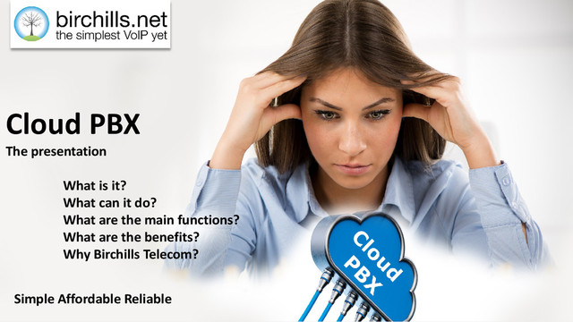 Duplicating and extending traditional PBX functions • Running on multiple servers in secure data centres across the UK Simple Affordable Reliable Cloud PBX The presentation