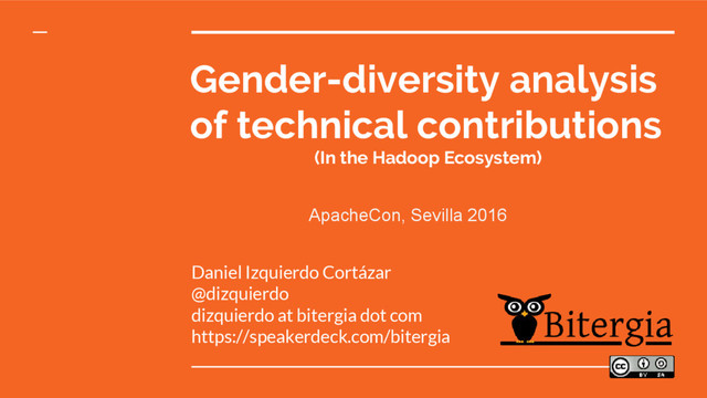 involved in understanding the gender diversity in some OSS communities Involved in some analytics dashboards: OPNFV, Wikimedia, Eclipse... Disclaimer: not involved in any working group, own analysis and interest, I may have missed some stuff...