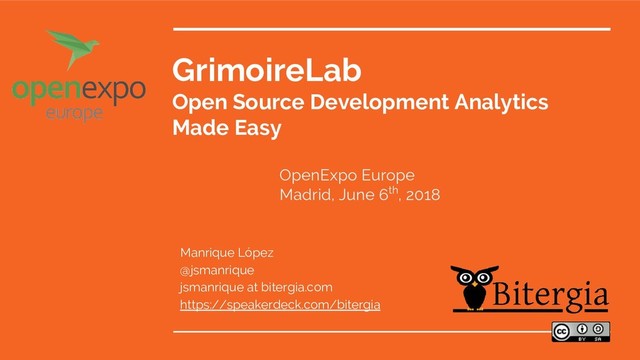 Quick intro to GrimoireLab, the free, open source software platform for software development and community analytics, done during OpenExpo Europe 2018