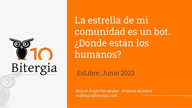 Si comparamos los principales actores del desarrollo de software de hace una década con los que tenemos ahora, vemos que una de las grandes diferencias es la inclusión del uso de cuentas automáticas (bots) que facilitan tareas de desarrollo, mantenimiento y gestión. De seguir esta tendencia, en un futuro no lejano la actividad automática será cada vez más y más relevante en el devenir de los proyectos. A la hora de analizar las comunidades de desarrollo de software libre, es imprescindible ser capaz de identificar estas cuentas para poder estudiar la salud de la comunidad. Esta charla muestra algunos de los retos identificando bots y algunas soluciones en las que estamos trabajando.