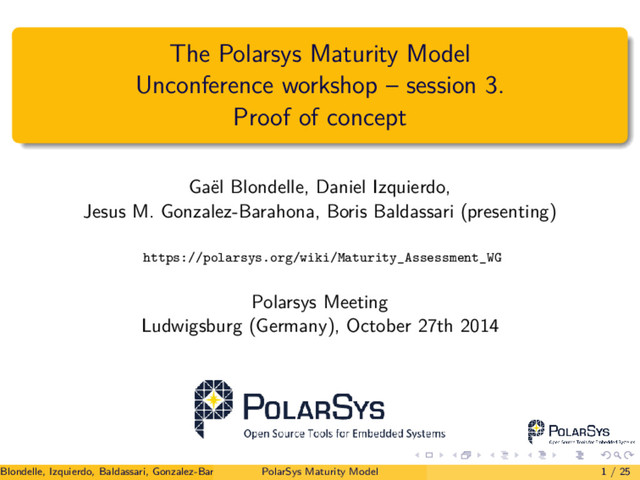 file. Complete description of the project. Access to all repositories: source, issue tracking, mailing lists. Links to all resources: download, getting started, build, wiki, web site. All releases, milestones, with dates and result (ongoing/fail/success). Blondelle, Izquierdo, Baldassari, Gonzalez-Barahona (PolarSys Maturity Assessment WG) PolarSys Maturity Model 12 / 25