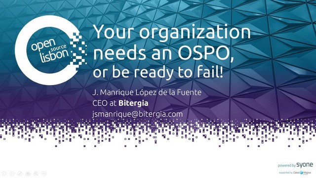 Talk abstract: Open source is becoming the main ingredient for companies to success. To achieve it, companies need to manage efficiently their relationship with open source projects. And that’s the main goal for companies’ Open Source Program Office (OSPO).