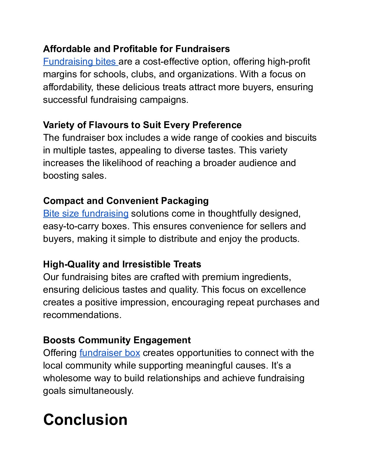 option, offering high-profit margins for schools, clubs, and organizations. With a focus on affordability, these delicious treats attract more buyers, ensuring successful fundraising campaigns. Variety of Flavours to Suit Every Preference The fundraiser box includes a wide range of cookies and biscuits in multiple tastes, appealing to diverse tastes. This variety increases the likelihood of reaching a broader audience and boosting sales. Compact and Convenient Packaging Bite size fundraising solutions come in thoughtfully designed, easy-to-carry boxes. This ensures convenience for sellers and buyers, making it simple to distribute and enjoy the products. High-Quality and Irresistible Treats Our fundraising bites are crafted with premium ingredients, ensuring delicious tastes and quality. This focus on excellence creates a positive impression, encouraging repeat purchases and recommendations. Boosts Community Engagement Offering fundraiser box creates opportunities to connect with the local community while supporting meaningful causes. It’s a wholesome way to build relationships and achieve fundraising goals simultaneously. Conclusion