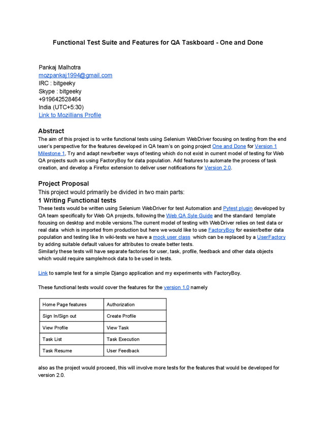 One and Done Pankaj Malhotra [email protected] IRC : bitgeeky Skype : bitgeeky +919642528464 India (UTC+5:30) Link to Mozillians Profile Abstract The aim of this project is to write functional tests using Selenium WebDriver focusing on testing from the end user’s perspective for the features developed in QA team’s on going project One and Done for Version 1 Milestone 1 , Try and adapt new/better ways of testing which do not exist in current model of testing for Web QA projects such as using FactoryBoy for data population. Add features to automate the process of task creation, and develop a Firefox extension to deliver user notifications for Version 2.0 . Project Proposal This project would primarily be divided in two main parts: 1 Writing Functional tests These tests would be written using Selenium WebDriver for test Automation and Pytest plugin developed by QA team specifically for Web QA projects, following the Web QA Syle Guide and the standard template focusing on desktop and mobile versions.The current model of testing with WebDriver relies on test data or real data which is imported from production but here we would like to use FactoryBoy for easier/better data population and testing like In wikitests we have a mock user class which can be replaced by a UserFactory by adding suitable default values for attributes to create better tests. Similarly these tests will have separate factories for user, task, profile, feedback and other data objects which would require sample/mock data to be used in tests. Link to sample test for a simple Django application and my experiments with FactoryBoy. These functional tests would cover the features for the version 1.0 namely Home Page features Authorization Sign In/Sign out Create Profile View Profile View Task Task List Task Execution Task Resume User Feedback also as the project would proceed, this will involve more tests for the features that would be developed for version 2.0.