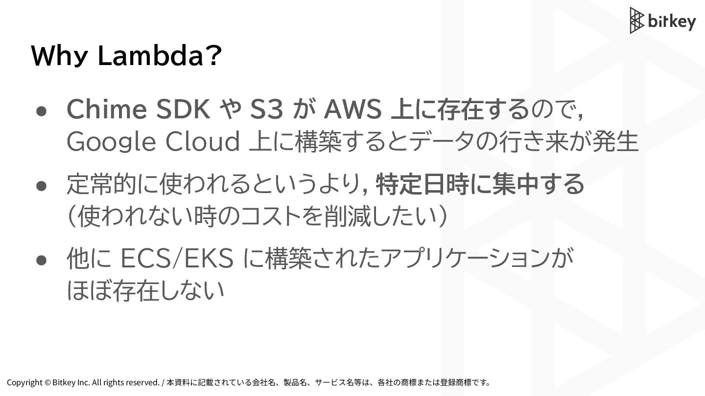 Lambda? • Chime SDK や S3 が AWS 上に存在するので, Google Cloud 上に構築するとデータの行き来が発生 • 定常的に使われるというより,特定日時に集中する (使われない時のコストを削減したい) • 他に ECS/EKS に構築されたアプリケーションが ほぼ存在しない