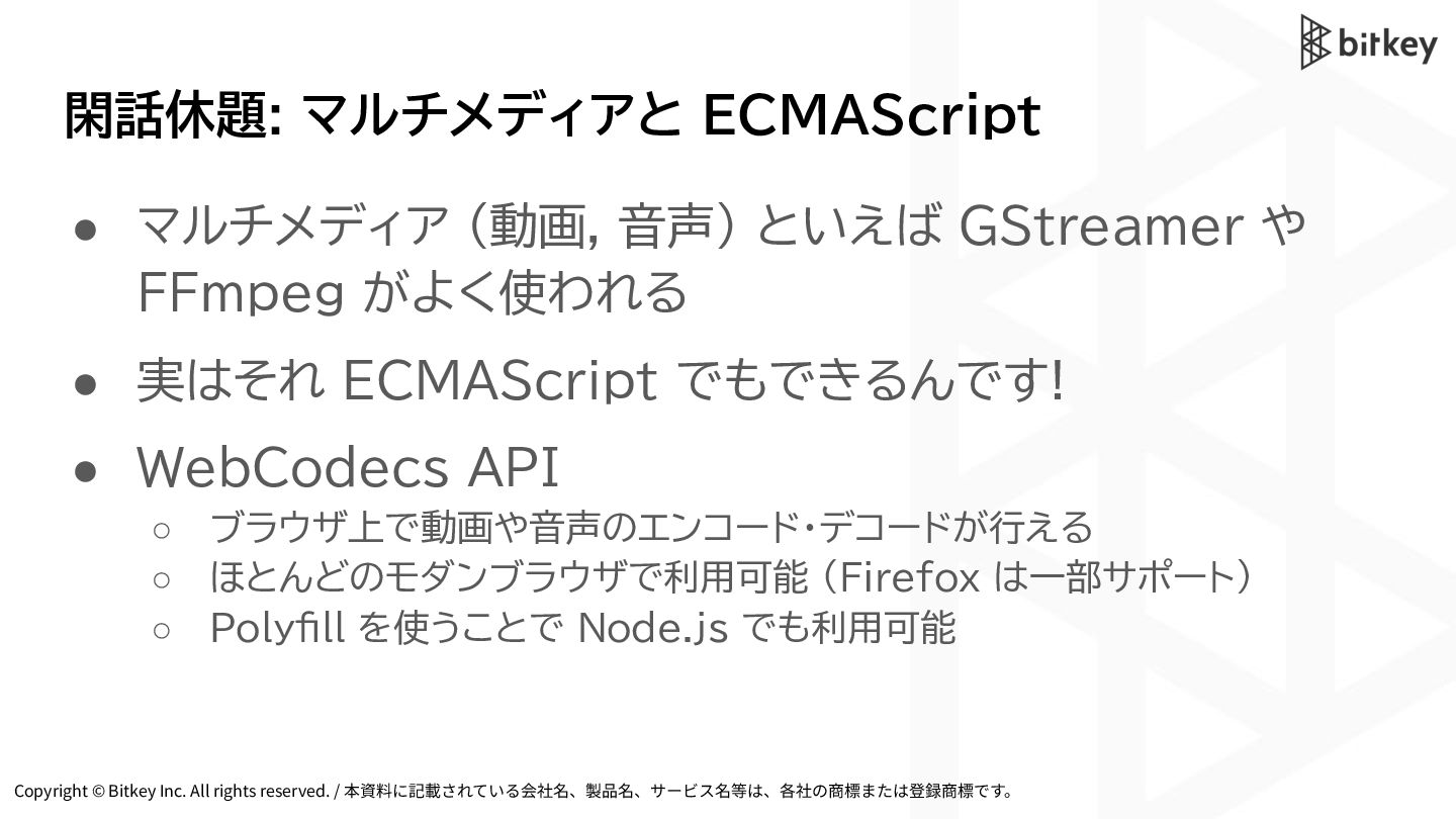 マルチメディアと ECMAScript • マルチメディア (動画, 音声) といえば GStreamer や FFmpeg がよく使われる • 実はそれ ECMAScript でもできるんです! • WebCodecs API ◦ ブラウザ上で動画や音声のエンコード・デコードが行える ◦ ほとんどのモダンブラウザで利用可能 (Firefox は一部サポート) ◦ Polyfill を使うことで Node.js でも利用可能