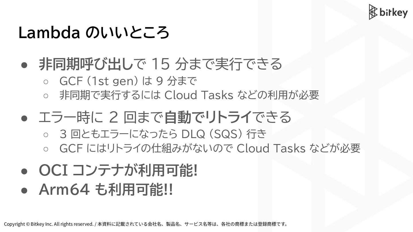 のいいところ • 非同期呼び出しで 15 分まで実行できる ◦ GCF (1st gen) は 9 分まで ◦ 非同期で実行するには Cloud Tasks などの利用が必要 • エラー時に 2 回まで自動でリトライできる ◦ 3 回ともエラーになったら DLQ (SQS) 行き ◦ GCF にはリトライの仕組みがないので Cloud Tasks などが必要 • OCI コンテナが利用可能! • Arm64 も利用可能!!