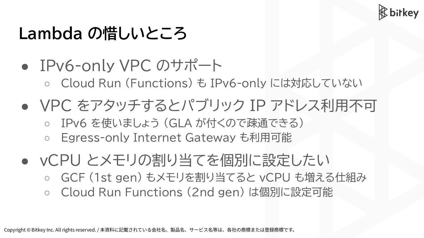 の惜しいところ • IPv6-only VPC のサポート ◦ Cloud Run (Functions) も IPv6-only には対応していない • VPC をアタッチするとパブリック IP アドレス利用不可 ◦ IPv6 を使いましょう (GLA が付くので疎通できる) ◦ Egress-only Internet Gateway も利用可能 • vCPU とメモリの割り当てを個別に設定したい ◦ GCF (1st gen) もメモリを割り当てると vCPU も増える仕組み ◦ Cloud Run Functions (2nd gen) は個別に設定可能