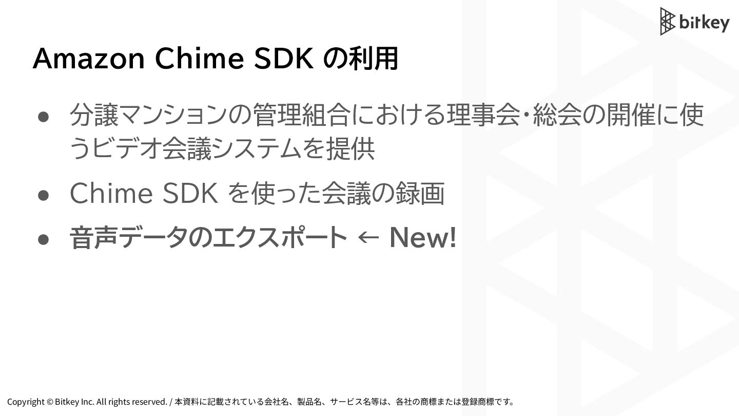 Chime SDK の利用 • 分譲マンションの管理組合における理事会・総会の開催に使 うビデオ会議システムを提供 • Chime SDK を使った会議の録画 • 音声データのエクスポート ← New!