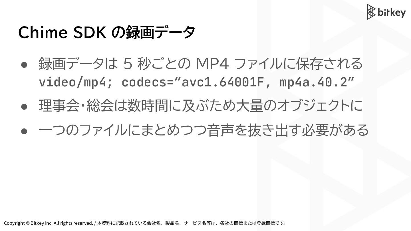 SDK の録画データ • 録画データは 5 秒ごとの MP4 ファイルに保存される video/mp4; codecs=”avc1.64001F, mp4a.40.2” • 理事会・総会は数時間に及ぶため大量のオブジェクトに • 一つのファイルにまとめつつ音声を抜き出す必要がある