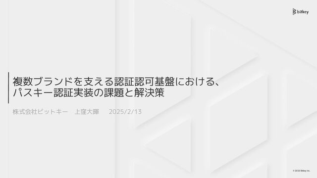 © 2025 Bitkey Inc. 複数ブランドを支える認証認可基盤における、 パスキー認証実装の課題と解決策 2025/2/13 株式会社ビットキー 上窪大暉
