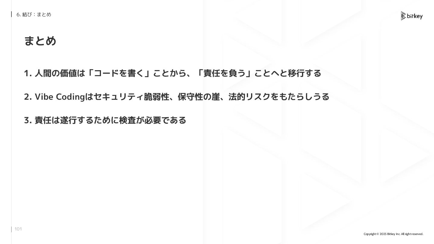 結び:まとめ 1. 人間の価値は「コードを書く」ことから、「責任を負う」ことへと移行する 2. Vibe Codingはセキュリティ脆弱性、保守性の崖、法的リスクをもたらしうる 3. 責任は遂行するために検査が必要である まとめ