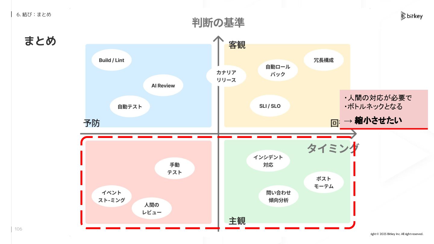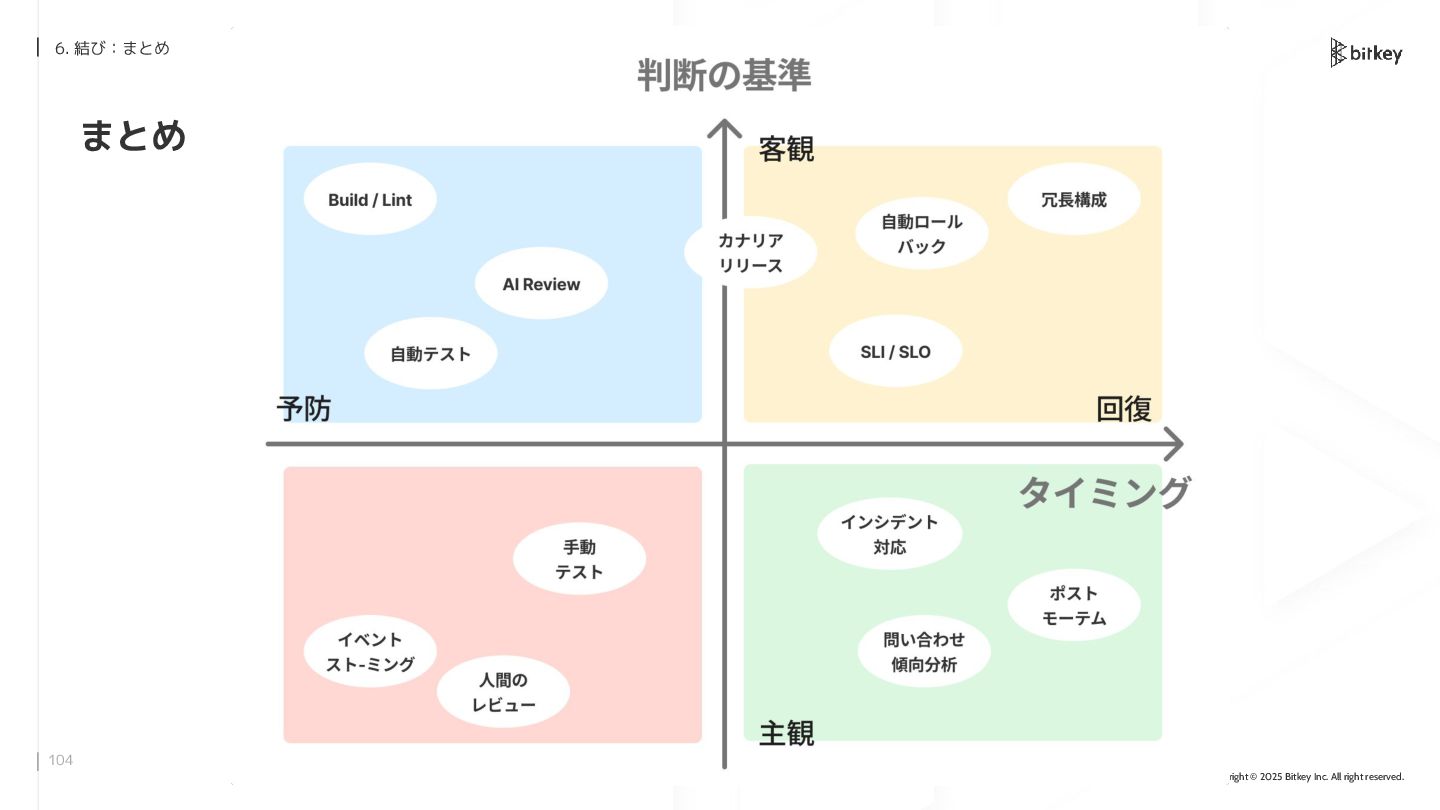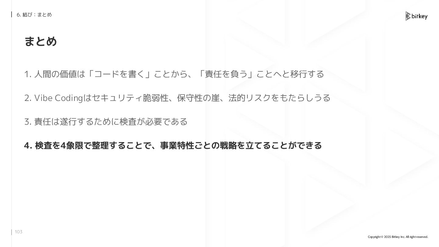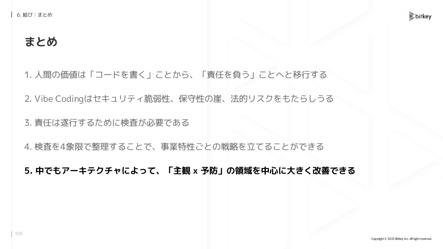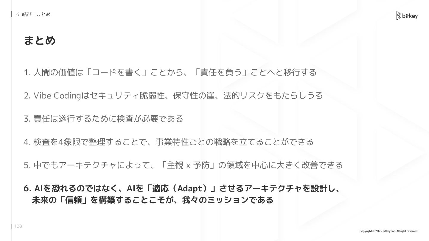 人間の価値は「コードを書く」ことから、「責任を負う」ことへと移行する 2. Vibe Codingはセキュリティ脆弱性、保守性の崖、法的リスクをもたらしうる 3. 責任は遂行するために検査が必要である 4. 検査を4象限で整理することで、事業特性ごとの戦略を立てることができる 5. 中でもアーキテクチャによって、「主観 x 予防」の領域を中心に大きく改善できる 6. AIを恐れるのではなく、AIを「適応(Adapt)」させるアーキテクチャを設計し、  未来の「信頼」を構築することこそが、我々のミッションである 6. 結び:まとめ まとめ