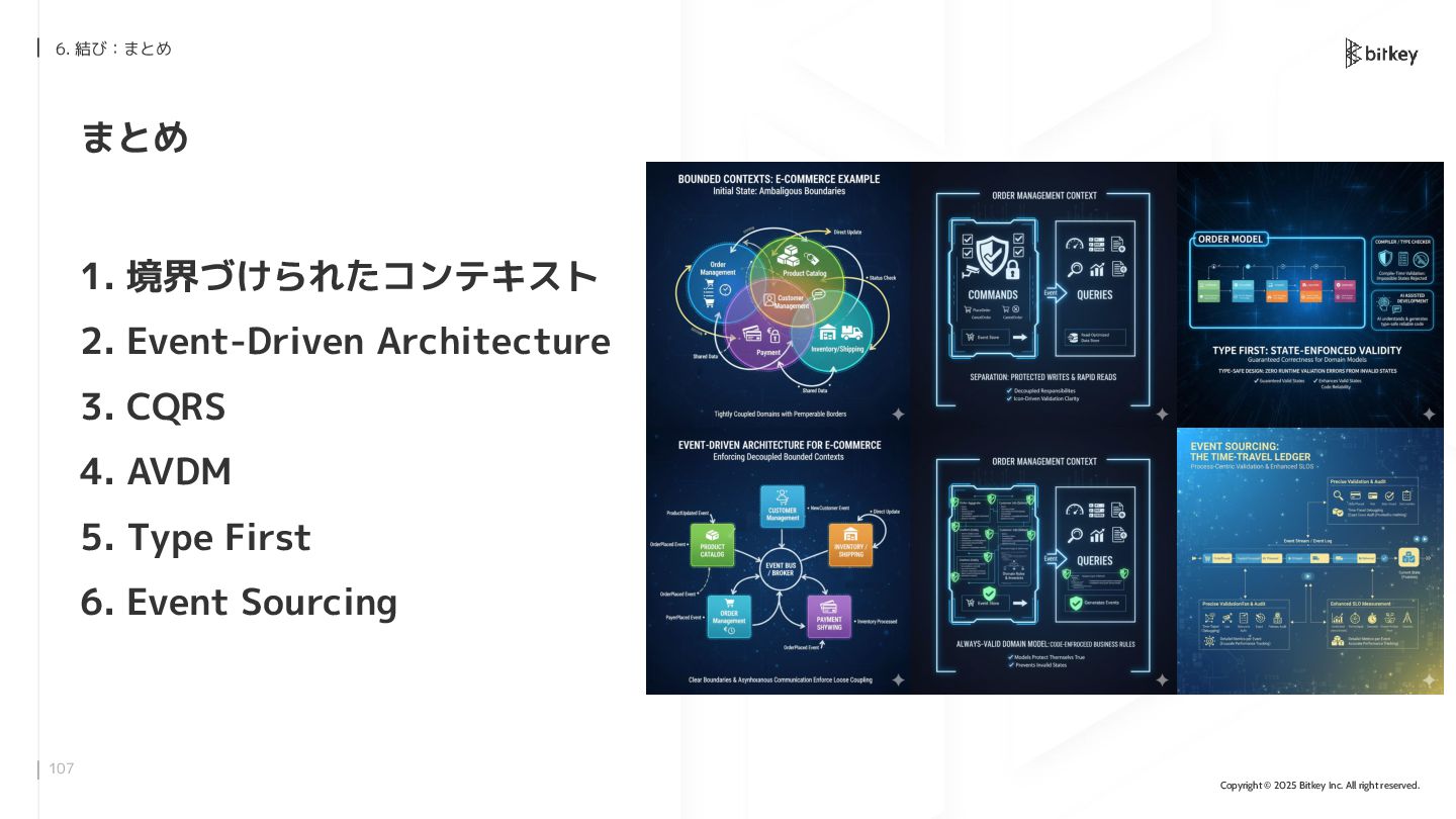 境界づけられたコンテキスト 2. Event-Driven Architecture 3. CQRS 4. AVDM 5. Type First 6. Event Sourcing 6. 結び:まとめ まとめ