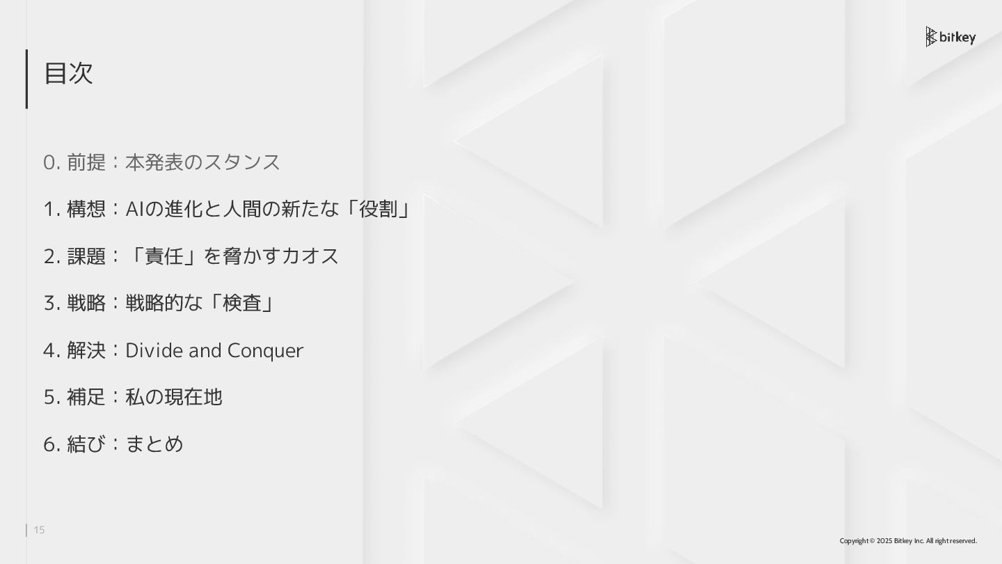 0. 前提:本発表のスタンス 1. 構想:AIの進化と人間の新たな「役割」 2. 課題:「責任」を脅かすカオス 3. 戦略:戦略的な「検査」 4. 解決:Divide and Conquer 5. 補足:私の現在地 6. 結び:まとめ