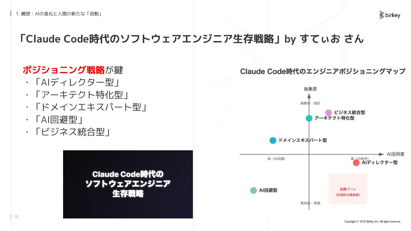 Code時代のソフトウェアエンジニア生存戦略」by すてぃお さん ポジショニング戦略が鍵 ・「AIディレクター型」 ・「アーキテクト特化型」 ・「ドメインエキスパート型」 ・「AI回避型」 ・「ビジネス統合型」 1. 構想:AIの進化と人間の新たな「役割」