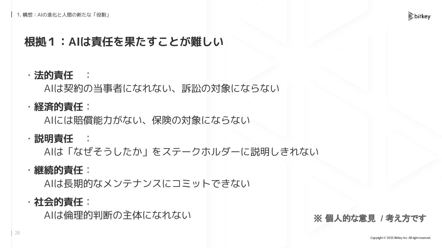 22. 28 Copyright © 2025 Bitkey Inc. All right reserved. 根拠1:AIは責任を果たすことが難しい