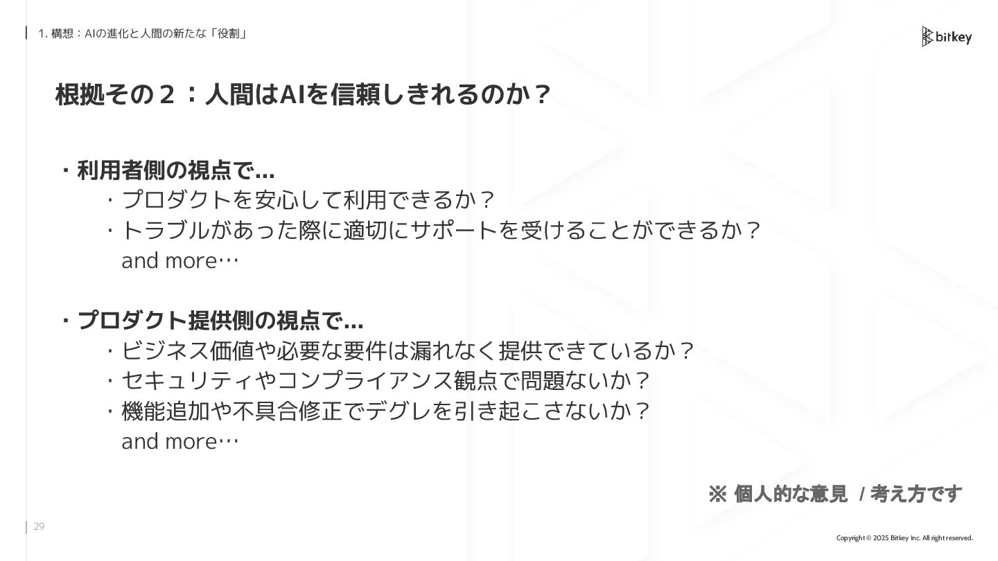 23. 29 Copyright © 2025 Bitkey Inc. All right reserved. 根拠その2:人間はAIを信頼しきれるのか?