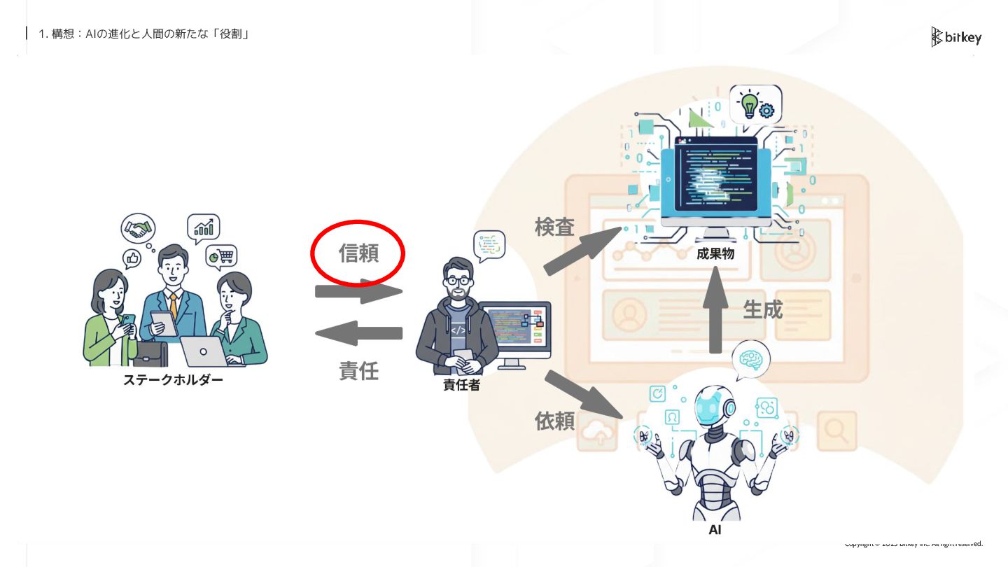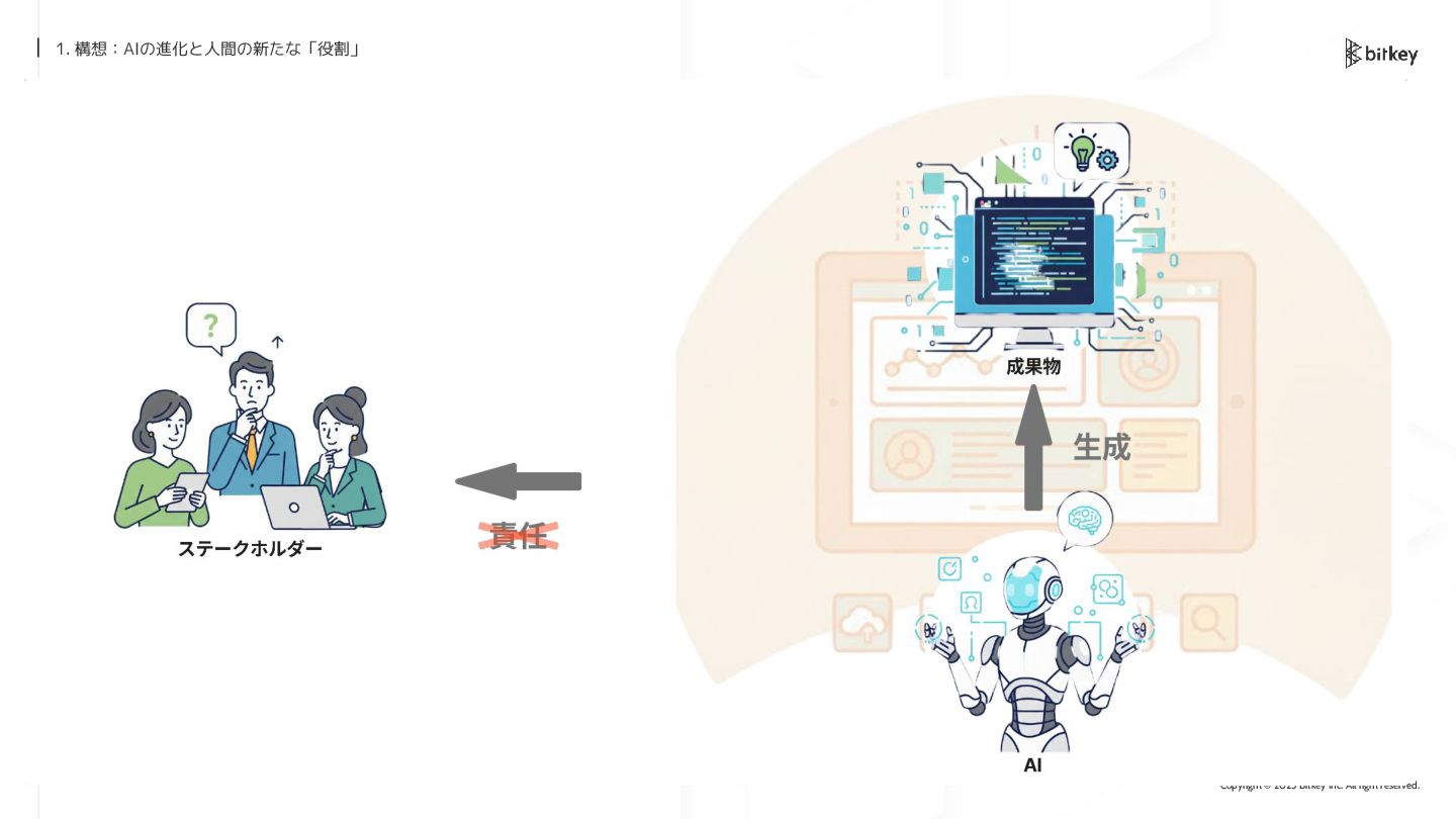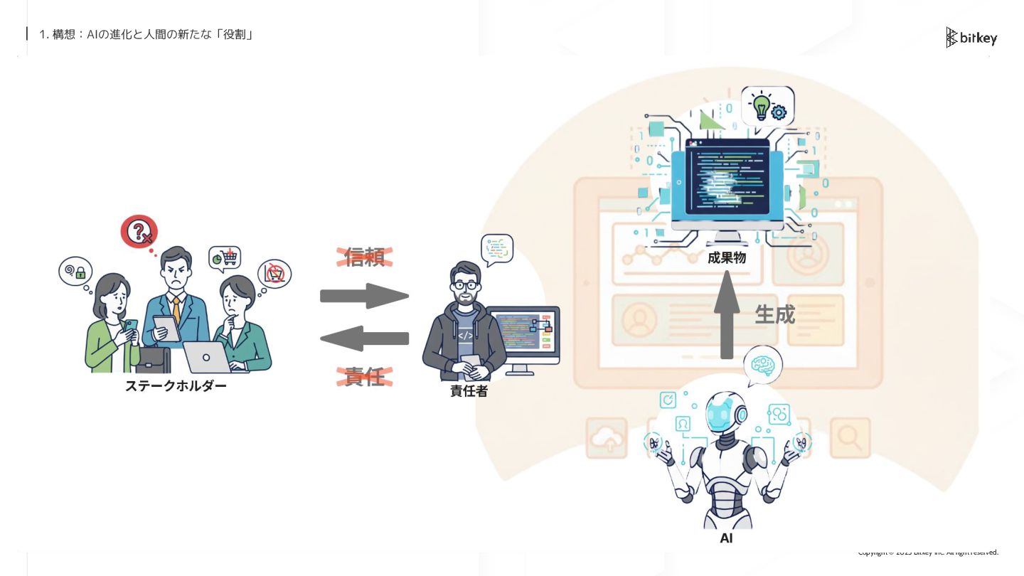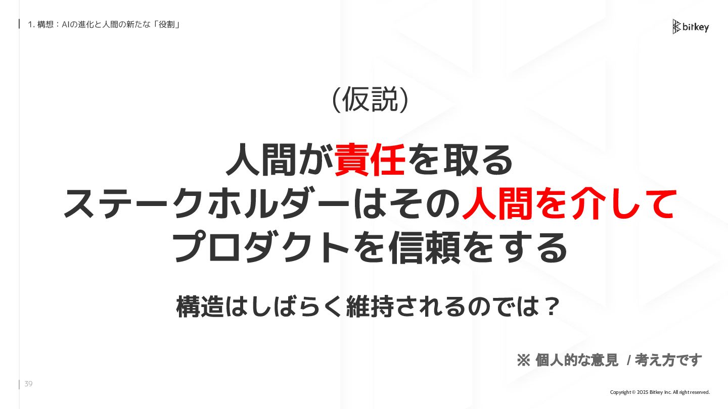 人間が責任を取る ステークホルダーはその人間を介して プロダクトを信頼をする 構造はしばらく維持されるのでは? ※ 個人的な意見 / 考え方です 1. 構想:AIの進化と人間の新たな「役割」