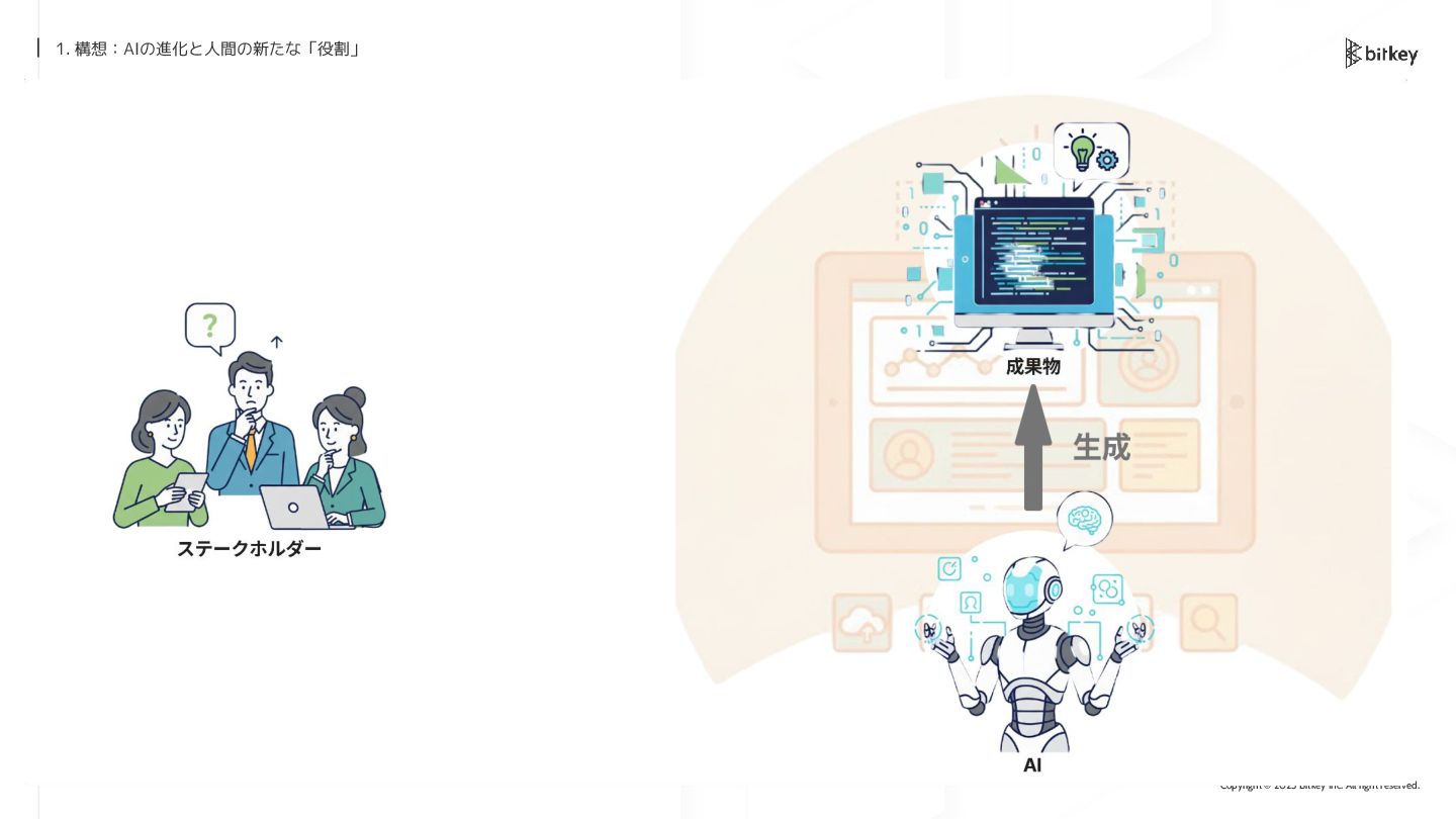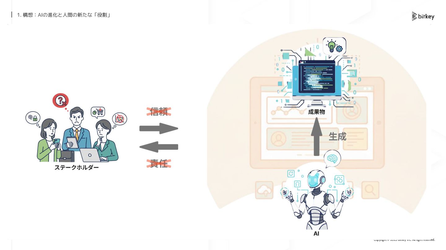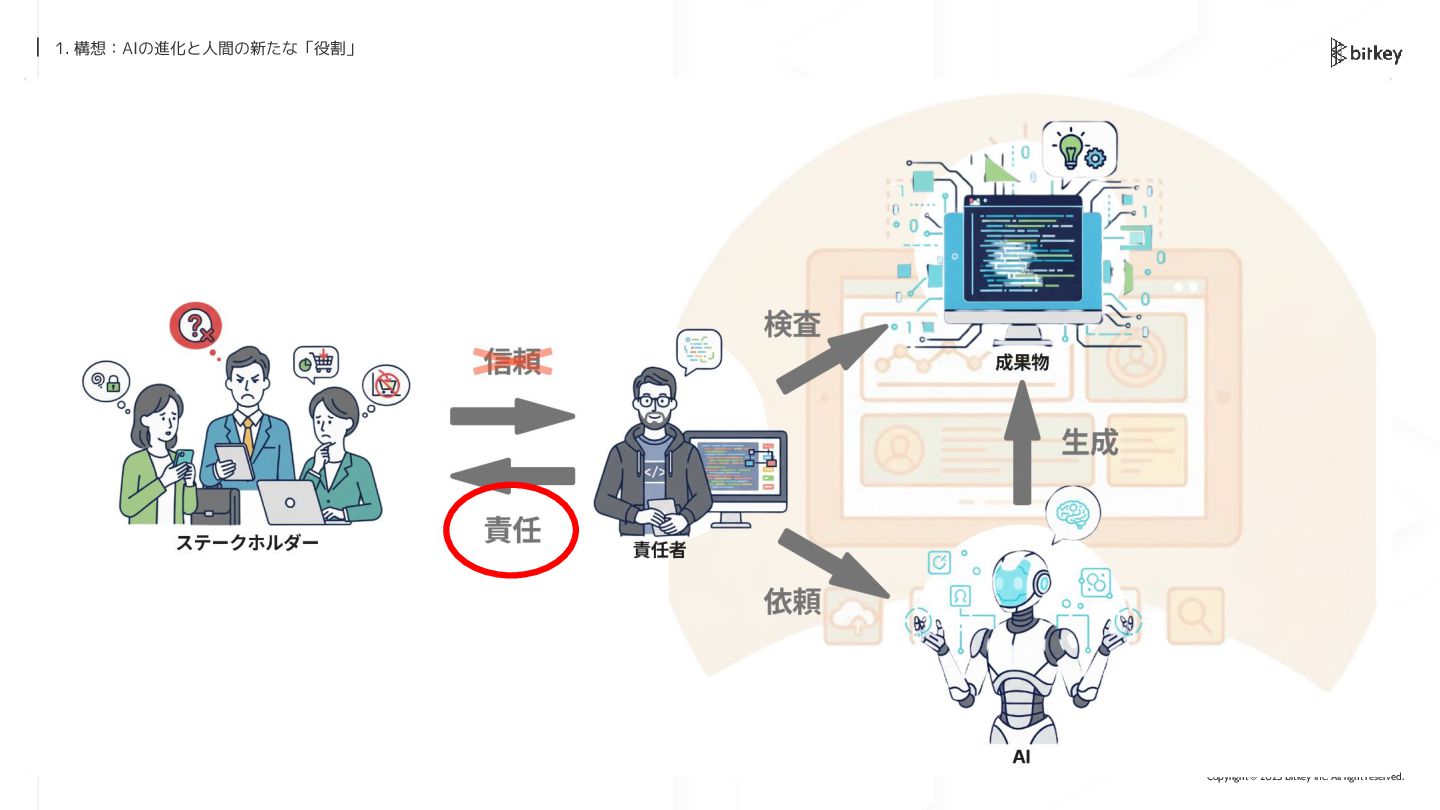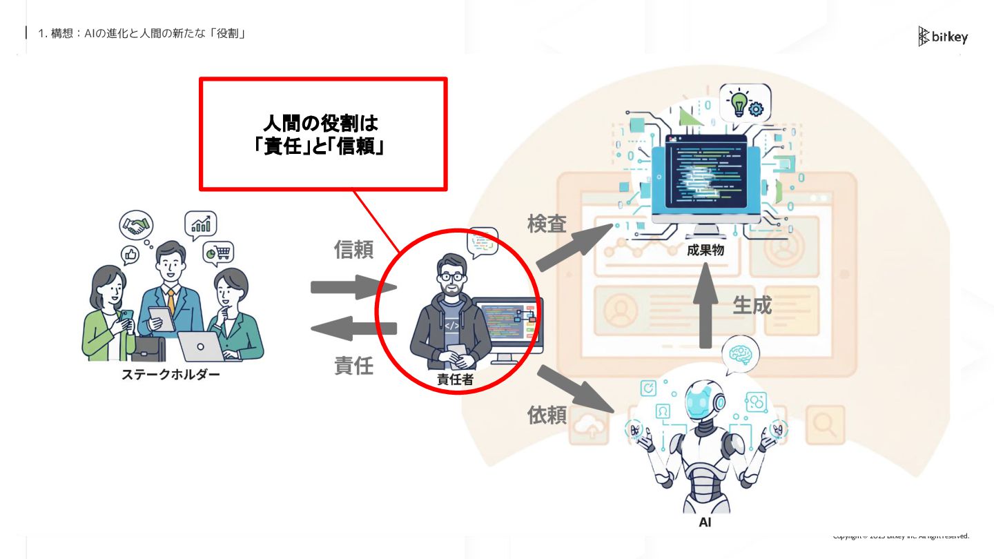 人間が責任を取る ステークホルダーはその人間を介して プロダクトを信頼をする 構造はしばらく維持されるのでは? ※ 個人的な意見 / 考え方です 1. 構想:AIの進化と人間の新たな「役割」