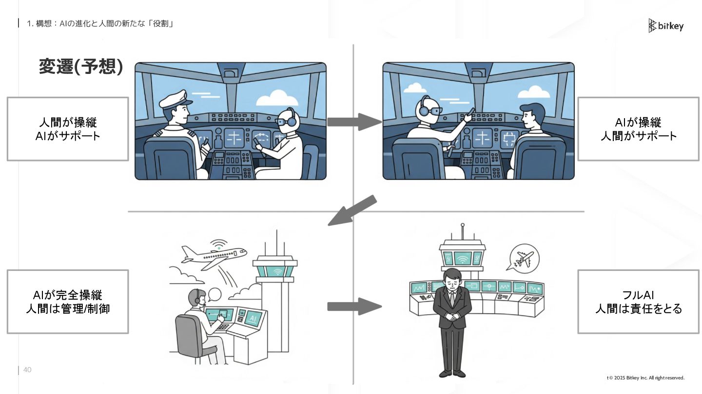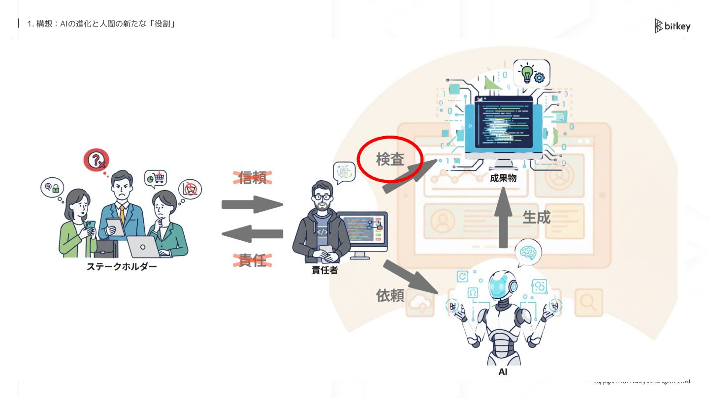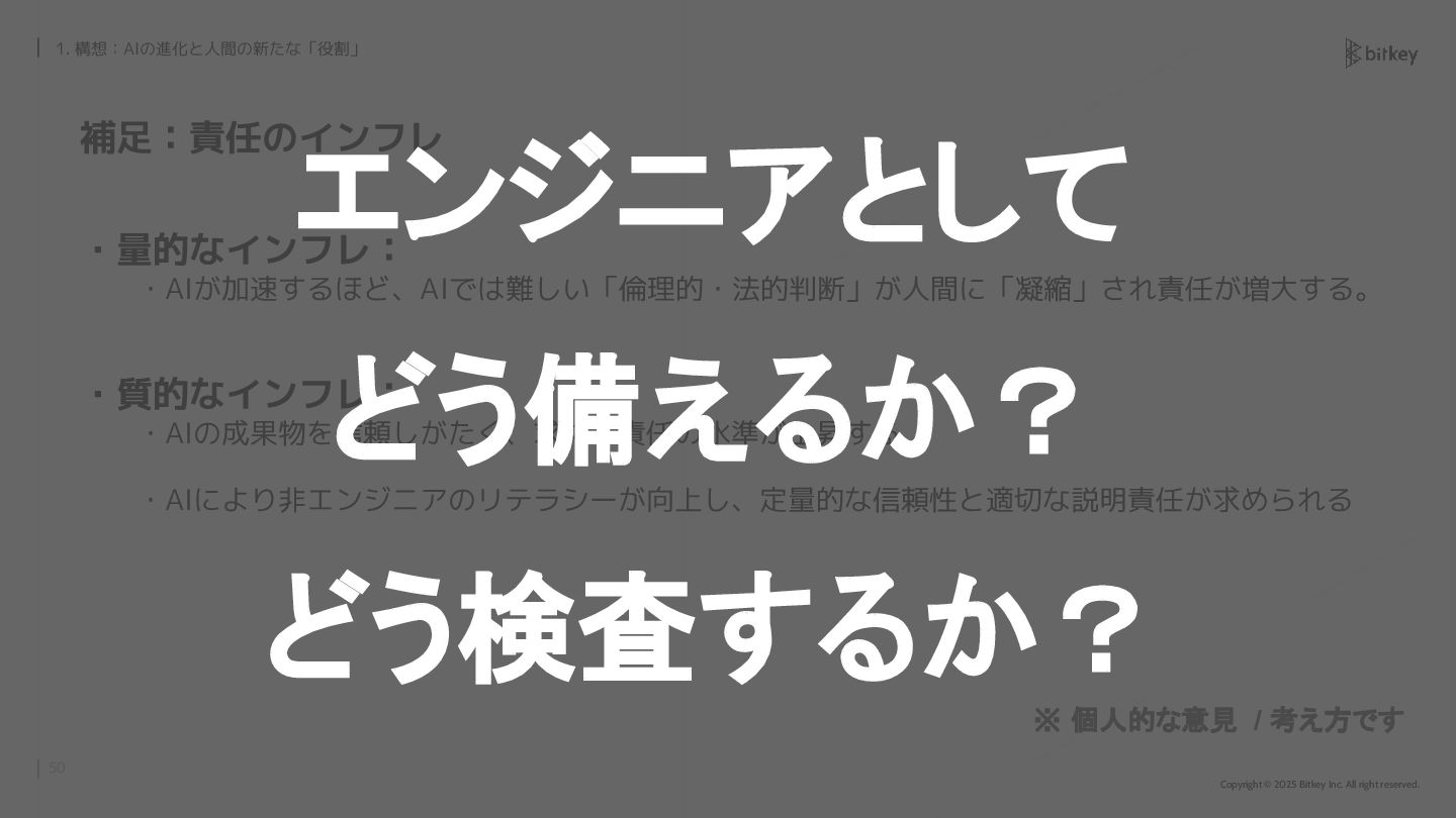 ・量的なインフレ:   ・AIが加速するほど、AIでは難しい「倫理的・法的判断」が人間に「凝縮」され責任が増大する。 ・質的なインフレ:   ・AIの成果物を信頼しがたく、求める責任の水準が上昇する   ・AIにより非エンジニアのリテラシーが向上し、定量的な信頼性と適切な説明責任が求められる ※ 個人的な意見 / 考え方です 1. 構想:AIの進化と人間の新たな「役割」 エンジニアとして どう備えるか? どう検査するか?