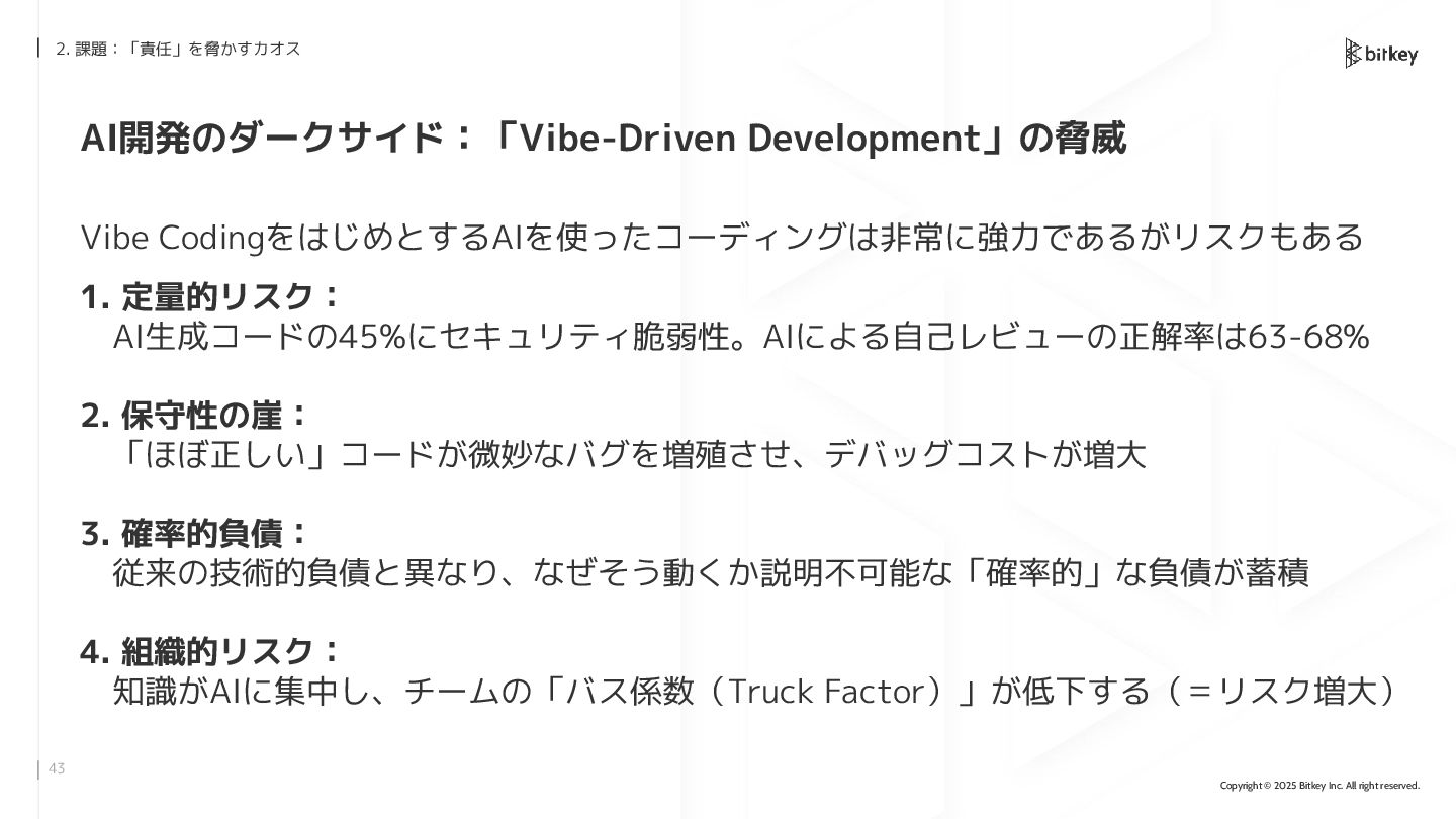 Development」の脅威 Vibe CodingをはじめとするAIを使ったコーディングは非常に強力であるがリスクもある 1. 定量的リスク:  AI生成コードの45%にセキュリティ脆弱性。AIによる自己レビューの正解率は63-68% 2. 保守性の崖:  「ほぼ正しい」コードが微妙なバグを増殖させ、デバッグコストが増大 3. 確率的負債:  従来の技術的負債と異なり、なぜそう動くか説明不可能な「確率的」な負債が蓄積 4. 組織的リスク:  知識がAIに集中し、チームの「バス係数(Truck Factor)」が低下する(=リスク増大) 2. 課題:「責任」を脅かすカオス