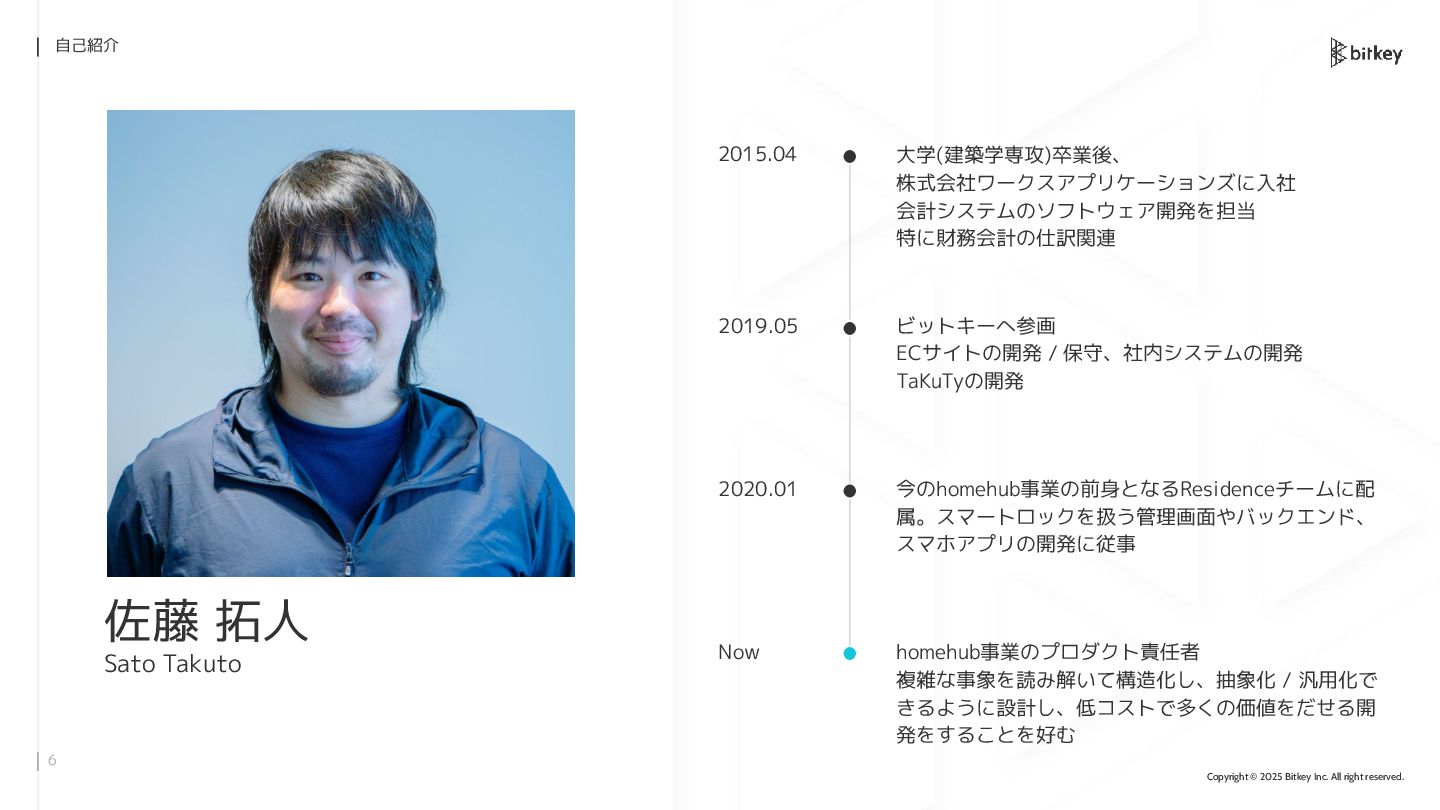 佐藤 拓人 Sato Takuto 2015.04 2019.05 2020.01 大学(建築学専攻)卒業後、 株式会社ワークスアプリケーションズに入社 会計システムのソフトウェア開発を担当 特に財務会計の仕訳関連 ビットキーへ参画 ECサイトの開発 / 保守、社内システムの開発 TaKuTyの開発 今のhomehub事業の前身となるResidenceチームに配 属。スマートロックを扱う管理画面やバックエンド、 スマホアプリの開発に従事 Now homehub事業のプロダクト責任者 複雑な事象を読み解いて構造化し、抽象化 / 汎用化で きるように設計し、低コストで多くの価値をだせる開 発をすることを好む