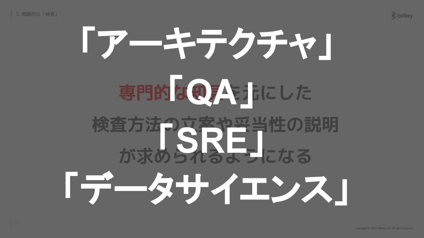 戦略的な「検査」 専門的な知見を元にした 検査方法の立案や妥当性の説明 が求められるようになる 「アーキテクチャ」 「QA」 「SRE」 「データサイエンス」