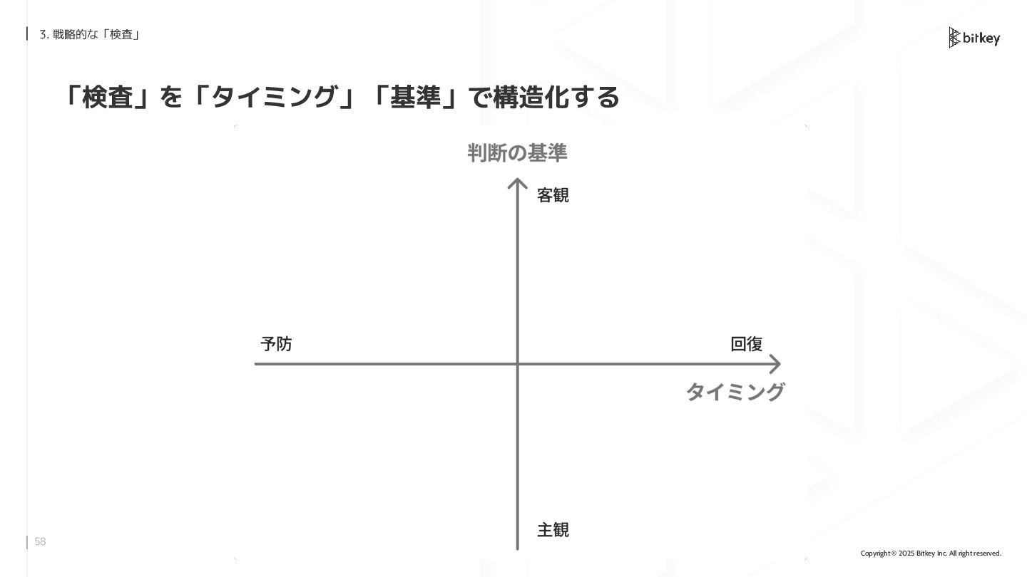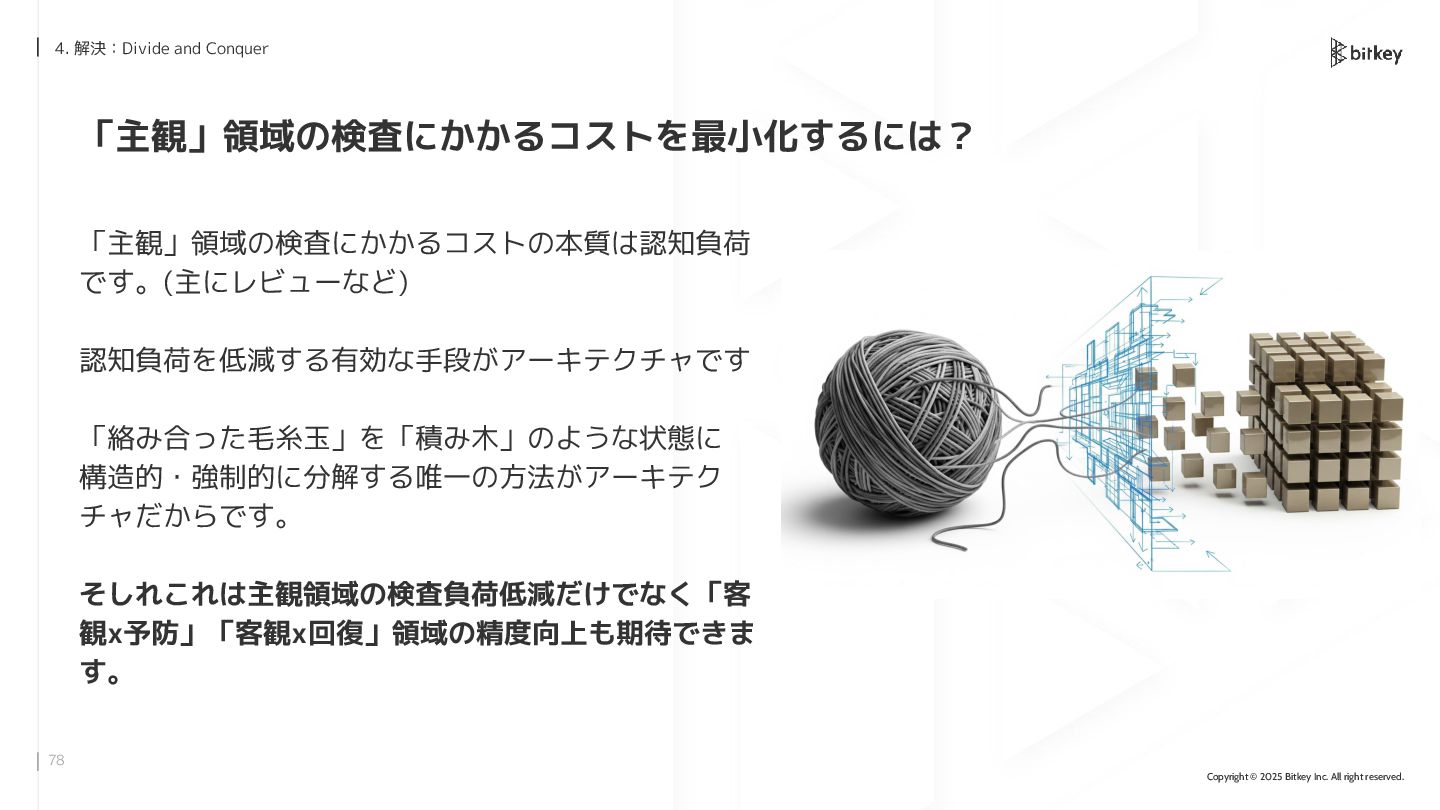 69. 78 Copyright © 2025 Bitkey Inc. All right reserved. 「主観」領域の検査にかかるコストの本質は認知負荷