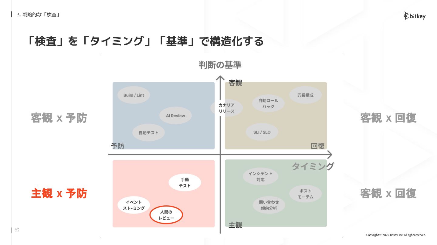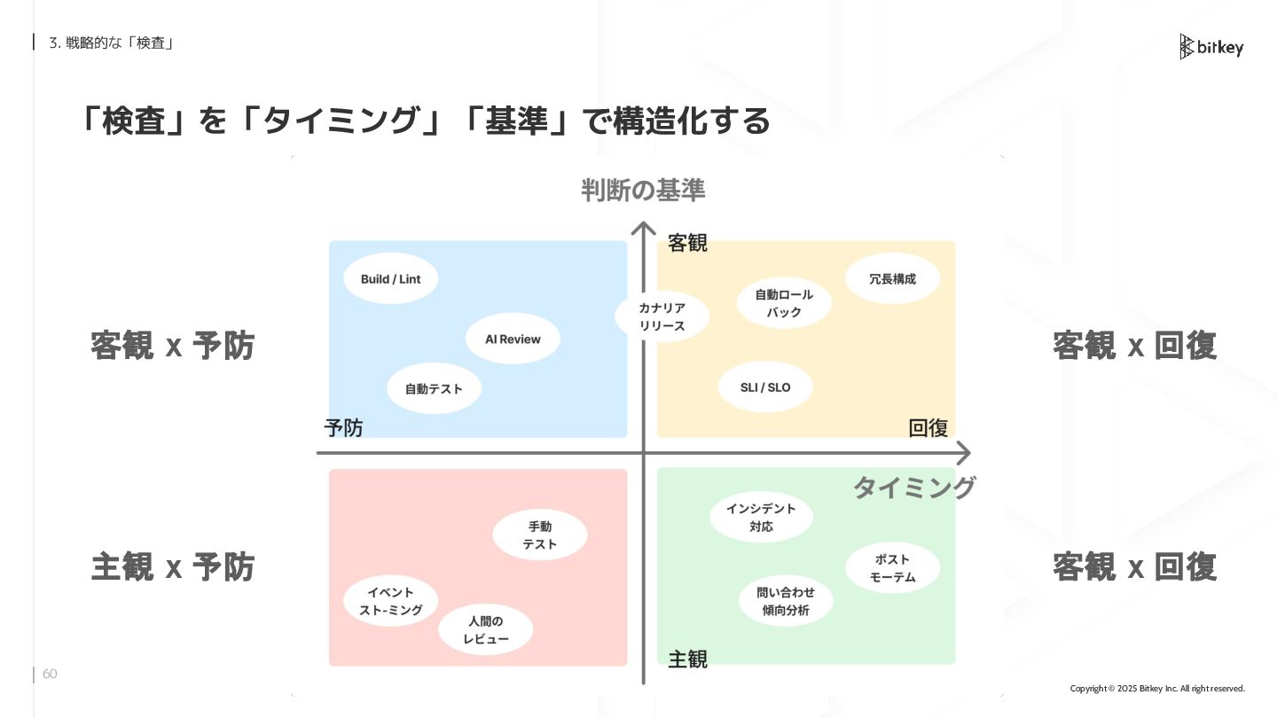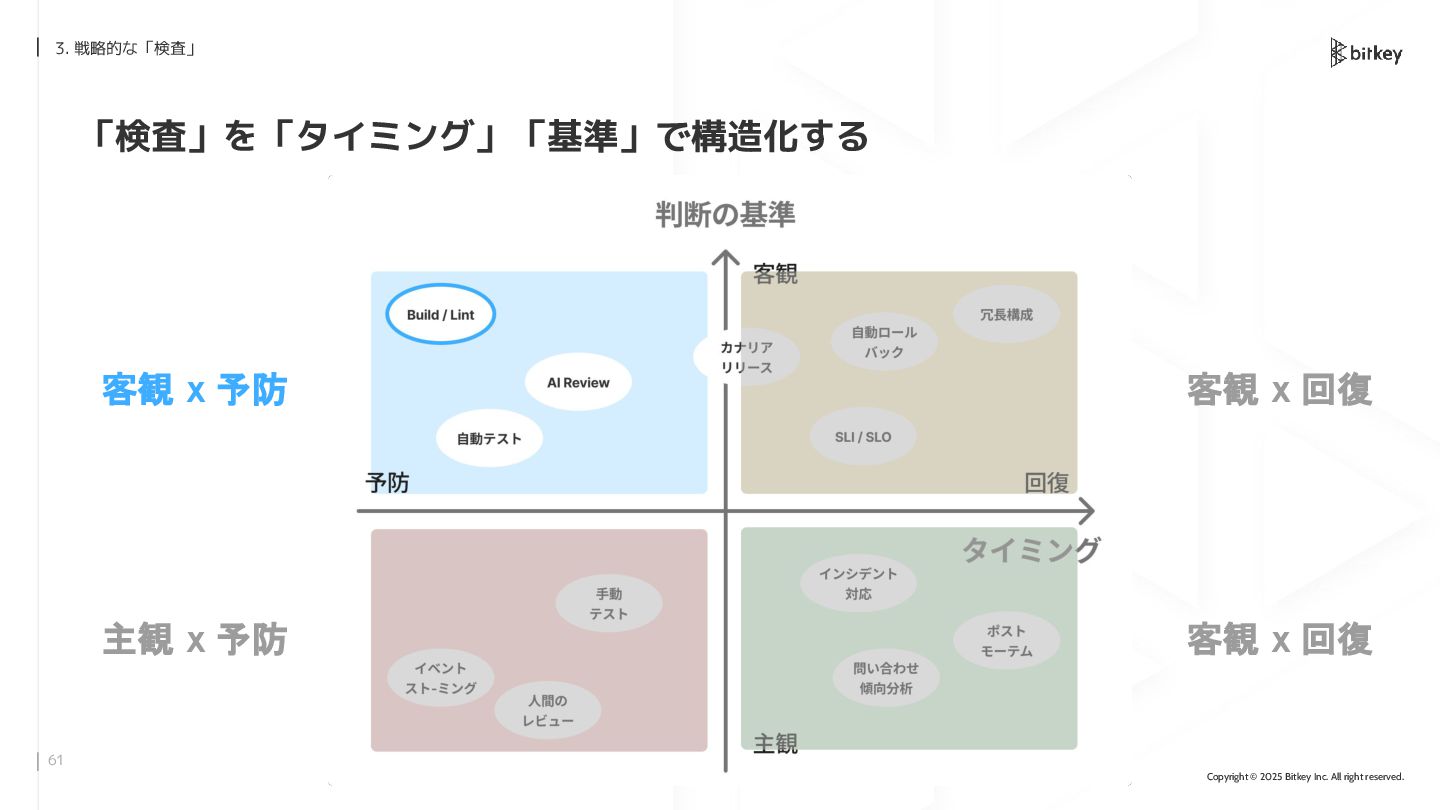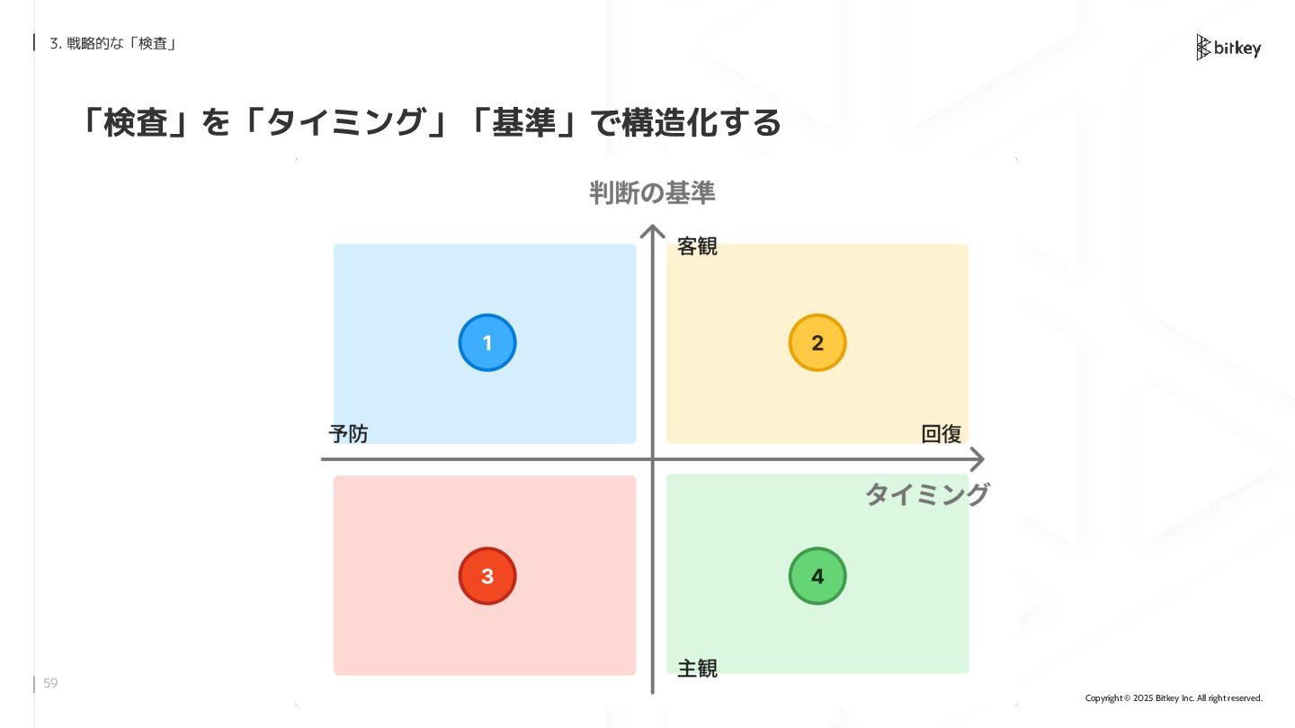 戦略的な「検査」 「検査」を「タイミング」「基準」で構造化する 主観 x 予防 客観 x 予防 客観 x 回復 客観 x 回復