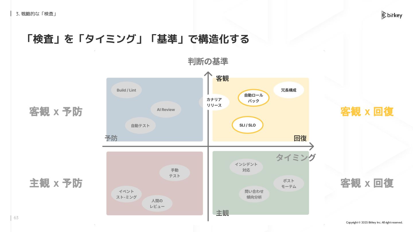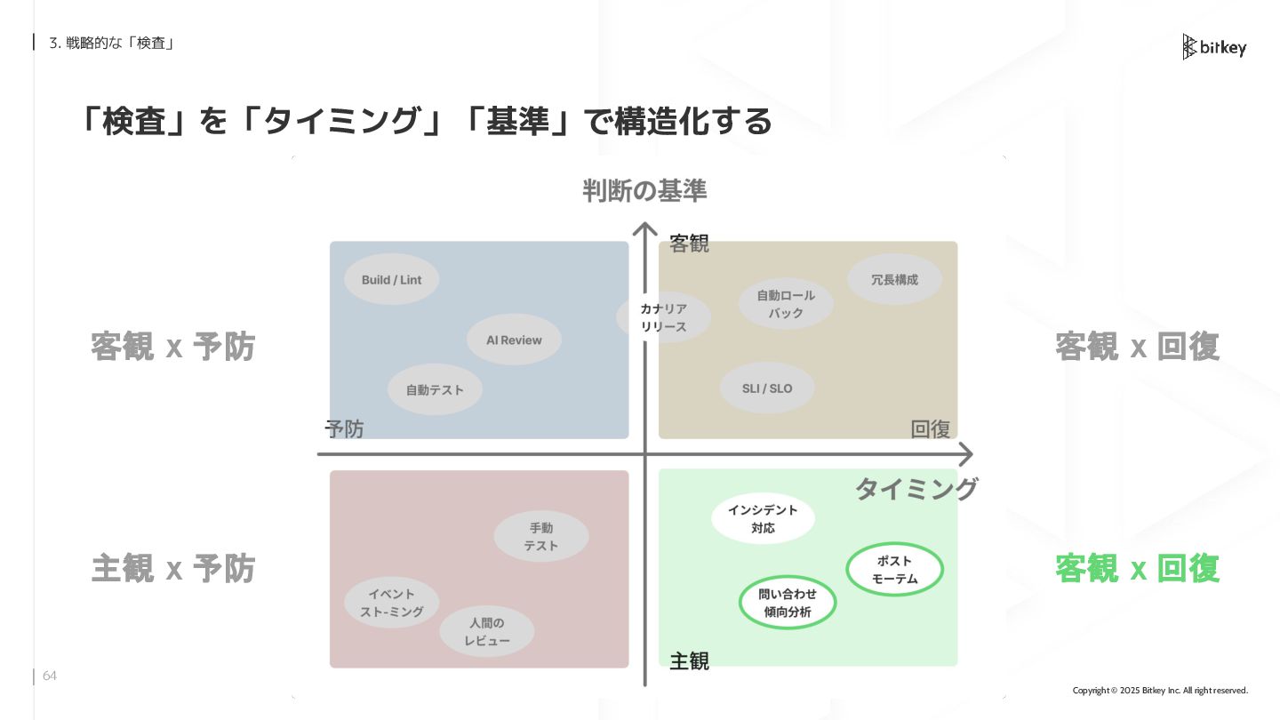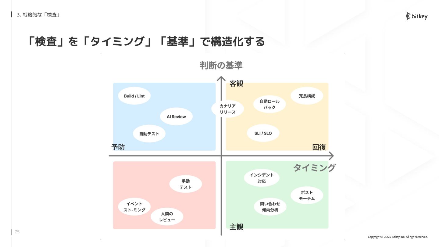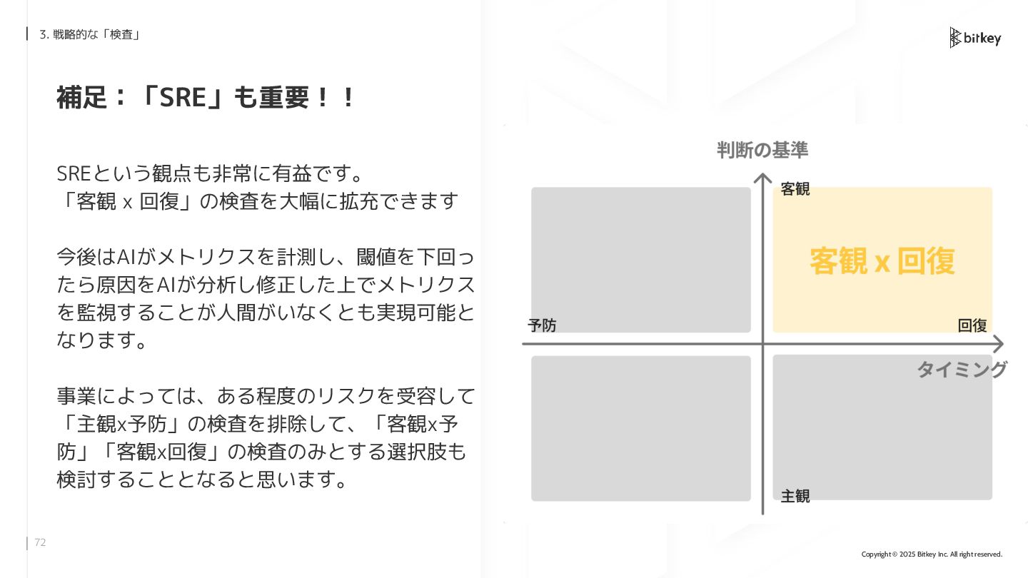 「客観 x 回復」の検査を大幅に拡充できます 今後はAIがメトリクスを計測し、閾値を下回っ たら原因をAIが分析し修正した上でメトリクス を監視することが人間がいなくとも実現可能と なります。 事業によっては、ある程度のリスクを受容して 「主観x予防」の検査を排除して、「客観x予 防」「客観x回復」の検査のみとする選択肢も 検討することとなると思います。 3. 戦略的な「検査」 補足:「SRE」も重要!!