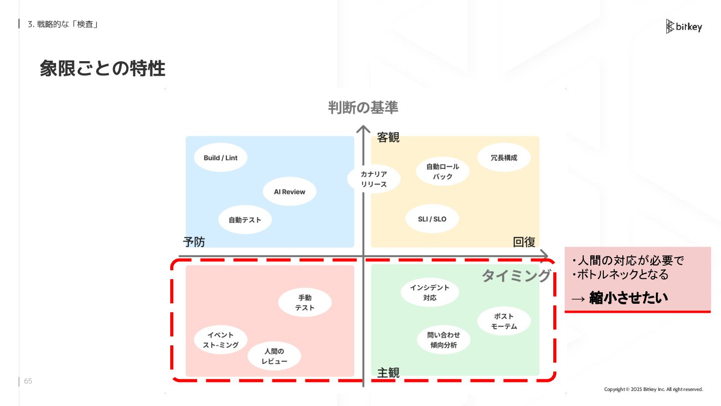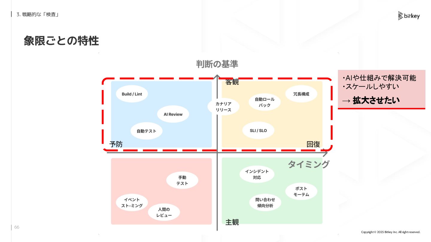 戦略的な「検査」 象限ごとの特性 ・人間の対応が必要で ・ボトルネックとなる → 縮小させたい