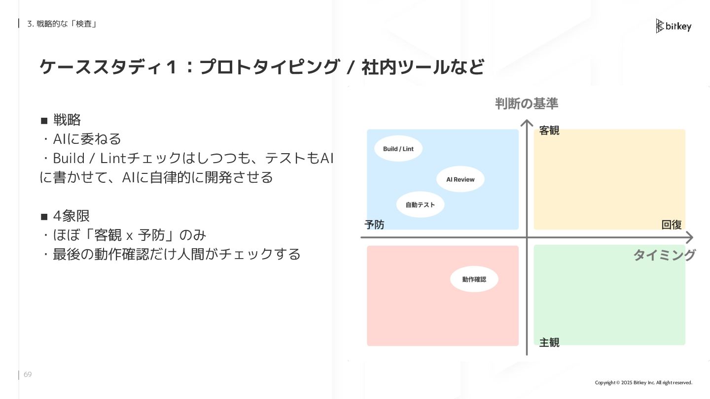 戦略的な「検査」 ケーススタディ1:プロトタイピング / 社内ツールなど ◼ 戦略 ・AIに委ねる ・Build / Lintチェックはしつつも、テストもAI に書かせて、AIに自律的に開発させる ◼ 4象限 ・ほぼ「客観 x 予防」のみ ・最後の動作確認だけ人間がチェックする