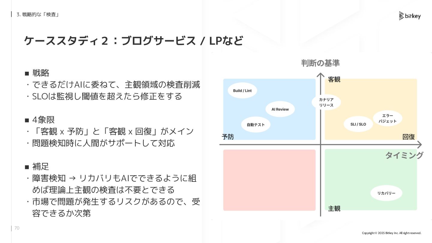 戦略 ・できるだけAIに委ねて、主観領域の検査削減 ・SLOは監視し閾値を超えたら修正をする ◼ 4象限 ・「客観 x 予防」と「客観 x 回復」がメイン ・問題検知時に人間がサポートして対応 ◼ 補足 ・障害検知 → リカバリもAIでできるように組  めば理論上主観の検査は不要とできる ・市場で問題が発生するリスクがあるので、受  容できるか次第 3. 戦略的な「検査」 ケーススタディ2:ブログサービス / LPなど