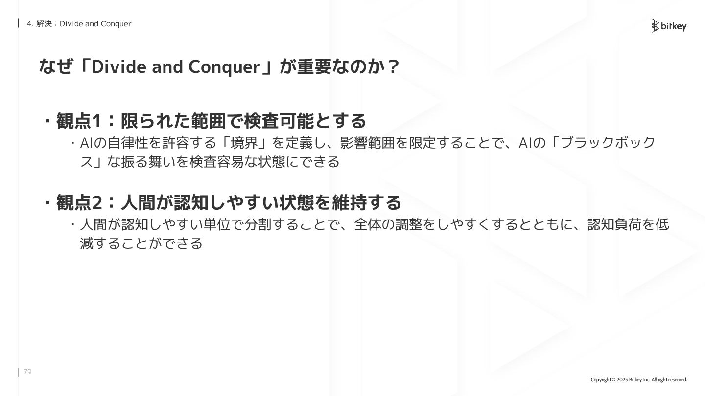 ・AIの自律性を許容する「境界」を定義し、影響範囲を限定することで、AIの「ブラックボック    ス」な振る舞いを検査容易な状態にできる ・観点2:人間が認知しやすい状態を維持する   ・人間が認知しやすい単位で分割することで、全体の調整をしやすくするとともに、認知負荷を低    減することができる なぜ「Divide and Conquer」が重要なのか? 4. 解決:Divide and Conquer