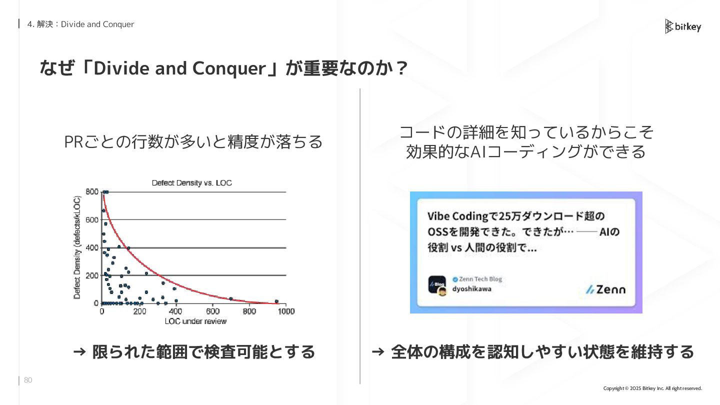 and Conquer」が重要なのか? PRごとの行数が多いと精度が落ちる 4. 解決:Divide and Conquer コードの詳細を知っているからこそ 効果的なAIコーディングができる → 限られた範囲で検査可能とする → 全体の構成を認知しやすい状態を維持する