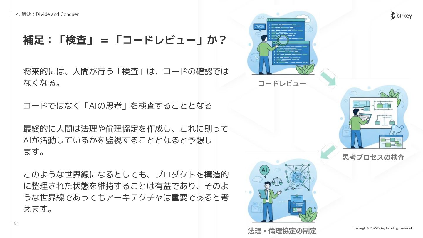 なくなる。 コードではなく「AIの思考」を検査することとなる 最終的に人間は法理や倫理協定を作成し、これに則って AIが活動しているかを監視することとなると予想し ます。 このような世界線になるとしても、プロダクトを構造的 に整理された状態を維持することは有益であり、そのよ うな世界線であってもアーキテクチャは重要であると考 えます。 補足:「検査」 = 「コードレビュー」か? 4. 解決:Divide and Conquer