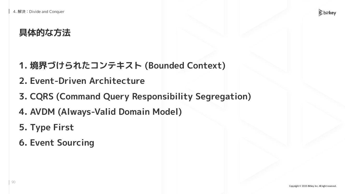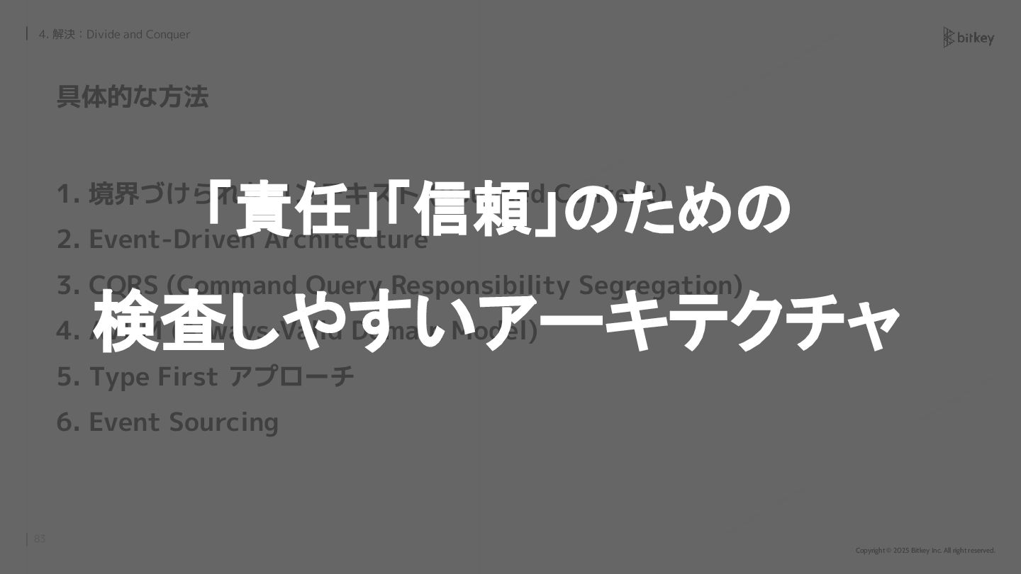 1. 境界づけられたコンテキスト (Bounded Context) 2. Event-Driven Architecture 3. CQRS (Command Query Responsibility Segregation) 4. AVDM (Always-Valid Domain Model) 5. Type First アプローチ 6. Event Sourcing 4. 解決:Divide and Conquer 「責任」「信頼」のための 検査しやすいアーキテクチャ