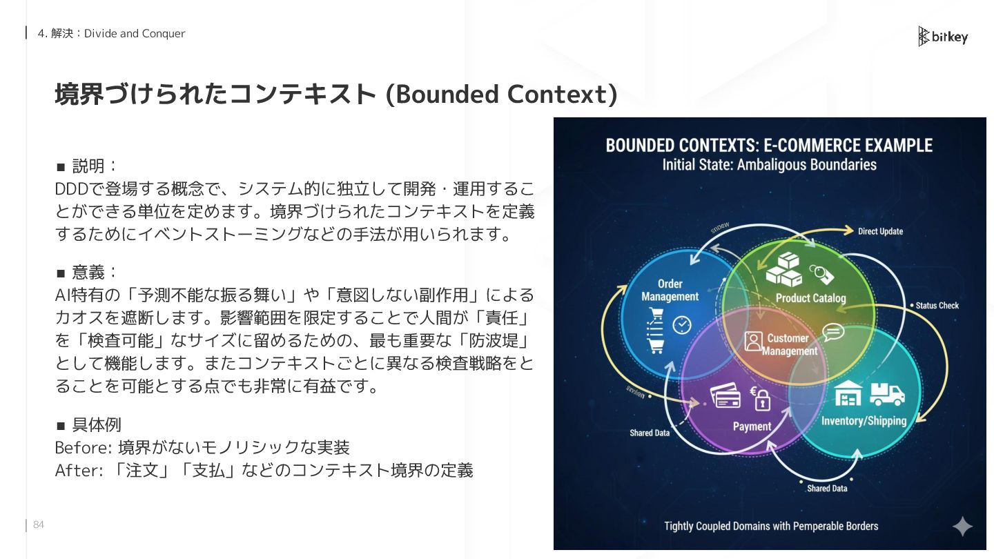 説明: DDDで登場する概念で、システム的に独立して開発・運用するこ とができる単位を定めます。境界づけられたコンテキストを定義 するためにイベントストーミングなどの手法が用いられます。 ◼ 意義: AI特有の「予測不能な振る舞い」や「意図しない副作用」による カオスを遮断します。影響範囲を限定することで人間が「責任」 を「検査可能」なサイズに留めるための、最も重要な「防波堤」 として機能します。またコンテキストごとに異なる検査戦略をと ることを可能とする点でも非常に有益です。 ◼ 具体例 Before: 境界がないモノリシックな実装 After: 「注文」「支払」などのコンテキスト境界の定義 境界づけられたコンテキスト (Bounded Context) 4. 解決:Divide and Conquer