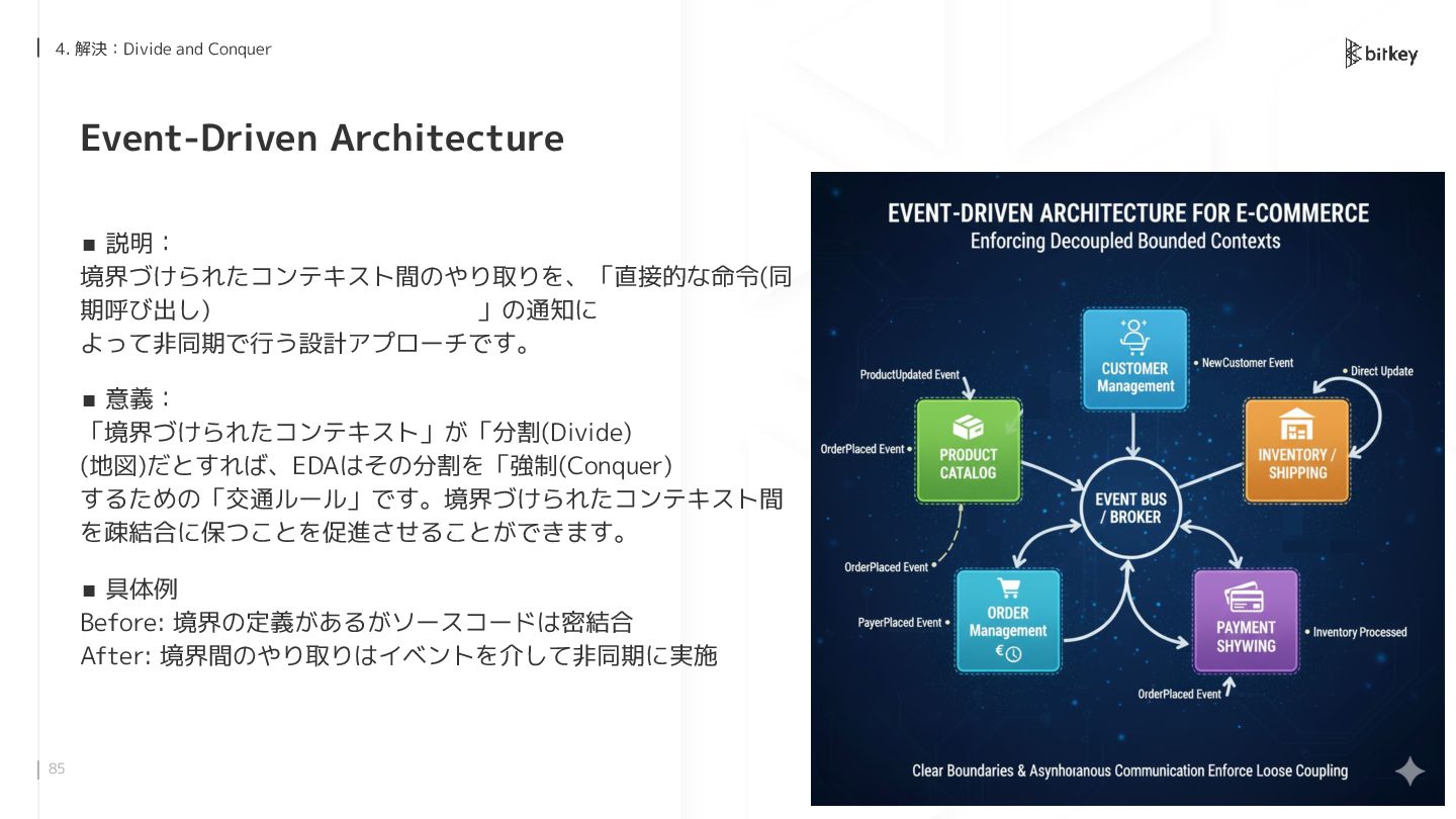 説明: 境界づけられたコンテキスト間のやり取りを、「直接的な命令(同 期呼び出し)」ではなく、「イベント(発生した事実)」の通知に よって非同期で行う設計アプローチです。 ◼ 意義: 「境界づけられたコンテキスト」が「分割(Divide)」という設計 (地図)だとすれば、EDAはその分割を「強制(Conquer)」し、統治 するための「交通ルール」です。境界づけられたコンテキスト間 を疎結合に保つことを促進させることができます。 ◼ 具体例 Before: 境界の定義があるがソースコードは密結合 After: 境界間のやり取りはイベントを介して非同期に実施 Event-Driven Architecture 4. 解決:Divide and Conquer