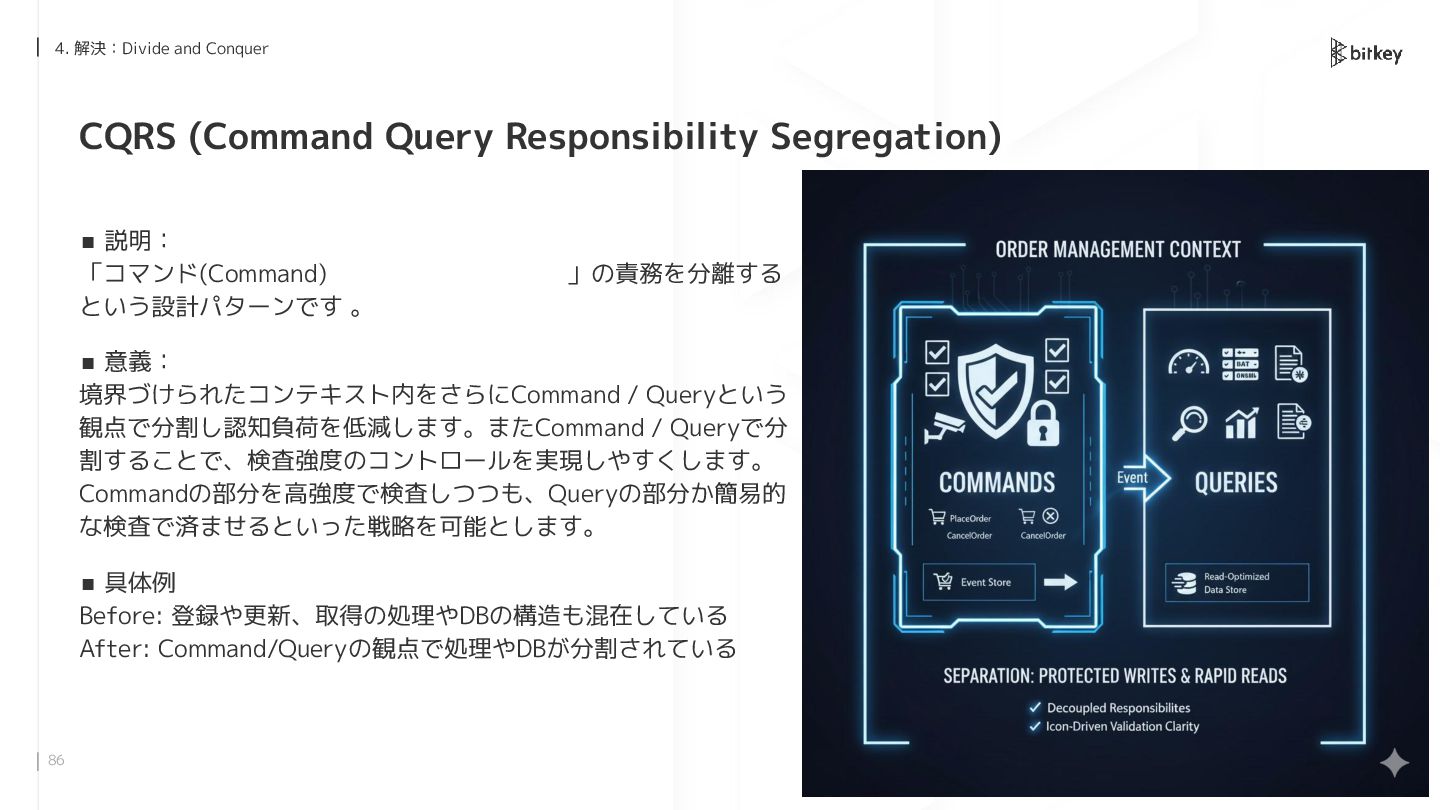 説明: 「コマンド(Command)」と「クエリ(Query)」の責務を分離する という設計パターンです 。 ◼ 意義: 境界づけられたコンテキスト内をさらにCommand / Queryという 観点で分割し認知負荷を低減します。またCommand / Queryで分 割することで、検査強度のコントロールを実現しやすくします。 Commandの部分を高強度で検査しつつも、Queryの部分か簡易的 な検査で済ませるといった戦略を可能とします。 ◼ 具体例 Before: 登録や更新、取得の処理やDBの構造も混在している After: Command/Queryの観点で処理やDBが分割されている CQRS (Command Query Responsibility Segregation) 4. 解決:Divide and Conquer