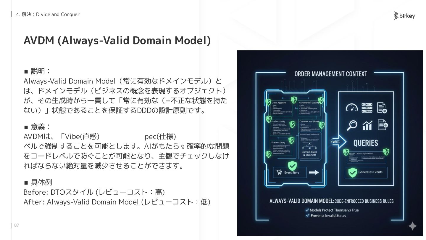 説明: Always-Valid Domain Model(常に有効なドメインモデル)と は、ドメインモデル(ビジネスの概念を表現するオブジェクト) が、その生成時から一貫して「常に有効な(=不正な状態を持た ない)」状態であることを保証するDDDの設計原則です。 ◼ 意義: AVDMは、「Vibe(直感)」を排除し、「Spec(仕様)」をコードレ ベルで強制することを可能とします。AIがもたらす確率的な問題 をコードレベルで防ぐことが可能となり、主観でチェックしなけ ればならない絶対量を減少させることができます。 ◼ 具体例 Before: DTOスタイル (レビューコスト:高) After: Always-Valid Domain Model (レビューコスト:低) AVDM (Always-Valid Domain Model) 4. 解決:Divide and Conquer