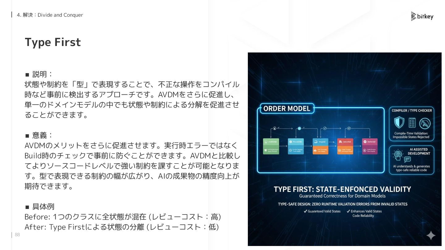 説明: 状態や制約を「型」で表現することで、不正な操作をコンパイル 時など事前に検出するアプローチです。AVDMをさらに促進し、 単一のドメインモデルの中でも状態や制約による分解を促進させ ることができます。 ◼ 意義: AVDMのメリットをさらに促進させます。実行時エラーではなく Build時のチェックで事前に防ぐことができます。AVDMと比較し てよりソースコードレベルで強い制約を課すことが可能となりま す。型で表現できる制約の幅が広がり、AIの成果物の精度向上が 期待できます。 ◼ 具体例 Before: 1つのクラスに全状態が混在 (レビューコスト:高) After: Type Firstによる状態の分離 (レビューコスト:低) Type First 4. 解決:Divide and Conquer