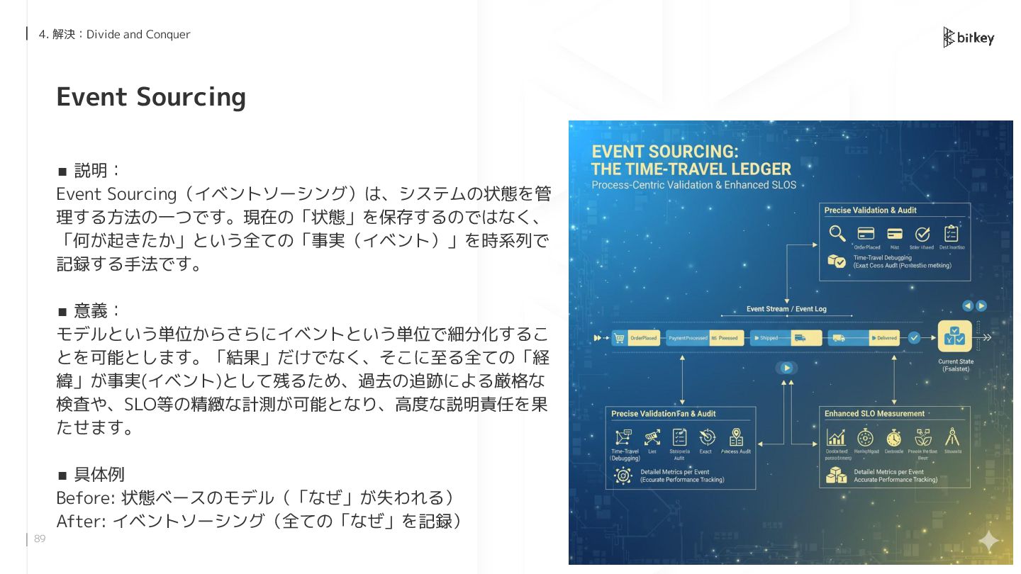 説明: Event Sourcing(イベントソーシング)は、システムの状態を管 理する方法の一つです。現在の「状態」を保存するのではなく、 「何が起きたか」という全ての「事実(イベント)」を時系列で 記録する手法です。 ◼ 意義: モデルという単位からさらにイベントという単位で細分化するこ とを可能とします。「結果」だけでなく、そこに至る全ての「経 緯」が事実(イベント)として残るため、過去の追跡による厳格な 検査や、SLO等の精緻な計測が可能となり、高度な説明責任を果 たせます。 ◼ 具体例 Before: 状態ベースのモデル(「なぜ」が失われる) After: イベントソーシング(全ての「なぜ」を記録) Event Sourcing 4. 解決:Divide and Conquer