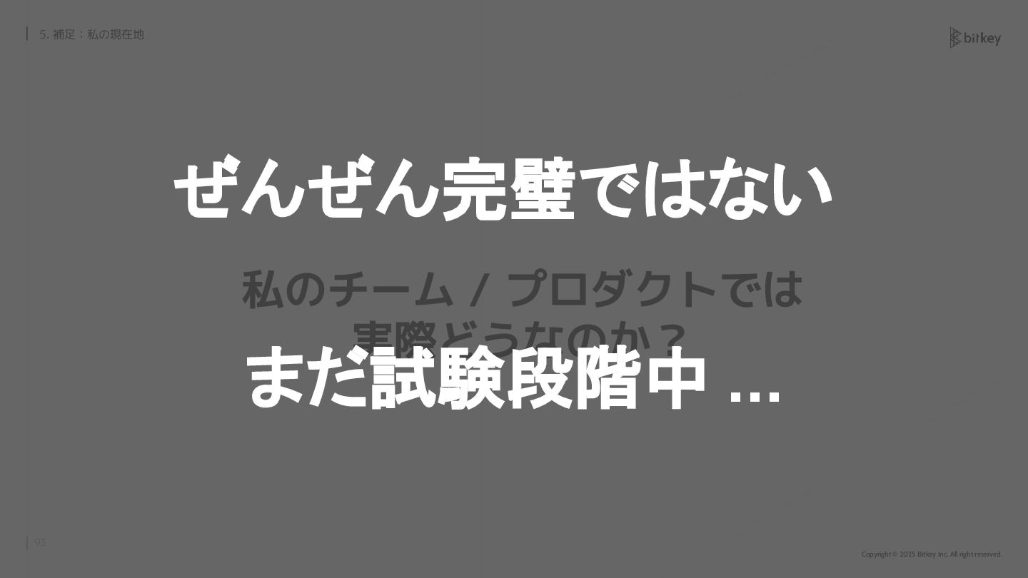 補足:私の現在地 私のチーム / プロダクトでは 実際どうなのか? ぜんぜん完璧ではない まだ試験段階中 ...