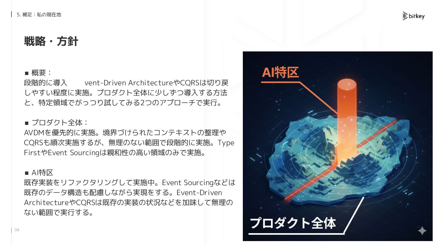 概要: 段階的に導入。特にEvent-Driven ArchitectureやCQRSは切り戻 しやすい程度に実施。プロダクト全体に少しずつ導入する方法 と、特定領域でがっつり試してみる2つのアプローチで実行。 ◼ プロダクト全体: AVDMを優先的に実施。境界づけられたコンテキストの整理や CQRSも順次実施するが、無理のない範囲で段階的に実施。Type FirstやEvent Sourcingは親和性の高い領域のみで実施。 ◼ AI特区 既存実装をリファクタリングして実施中。Event Sourcingなどは 既存のデータ構造も配慮しながら実現をする。Event-Driven ArchitectureやCQRSは既存の実装の状況などを加味して無理の ない範囲で実行する。 5. 補足:私の現在地 戦略・方針