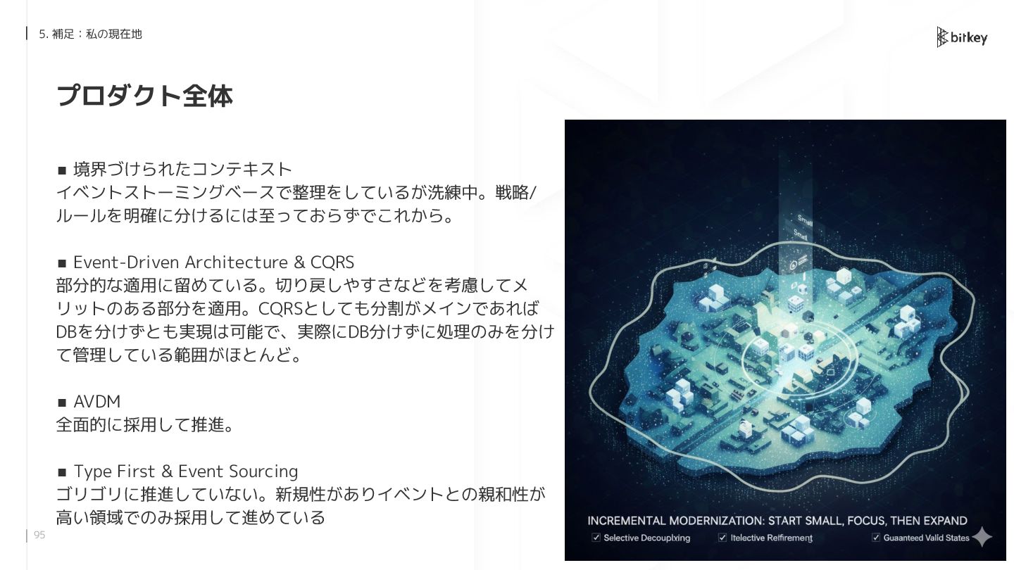 境界づけられたコンテキスト イベントストーミングベースで整理をしているが洗練中。戦略/ ルールを明確に分けるには至っておらずでこれから。 ◼ Event-Driven Architecture & CQRS 部分的な適用に留めている。切り戻しやすさなどを考慮してメ リットのある部分を適用。CQRSとしても分割がメインであれば DBを分けずとも実現は可能で、実際にDB分けずに処理のみを分け て管理している範囲がほとんど。 ◼ AVDM 全面的に採用して推進。 ◼ Type First & Event Sourcing ゴリゴリに推進していない。新規性がありイベントとの親和性が 高い領域でのみ採用して進めている 5. 補足:私の現在地 プロダクト全体