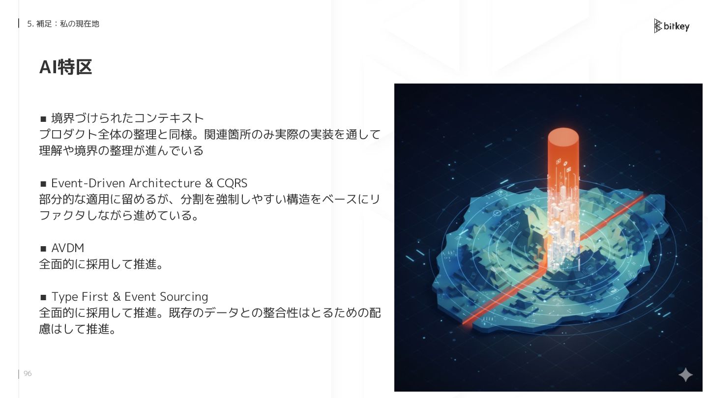 境界づけられたコンテキスト プロダクト全体の整理と同様。関連箇所のみ実際の実装を通して 理解や境界の整理が進んでいる ◼ Event-Driven Architecture & CQRS 部分的な適用に留めるが、分割を強制しやすい構造をベースにリ ファクタしながら進めている。 ◼ AVDM 全面的に採用して推進。 ◼ Type First & Event Sourcing 全面的に採用して推進。既存のデータとの整合性はとるための配 慮はして推進。 5. 補足:私の現在地 AI特区